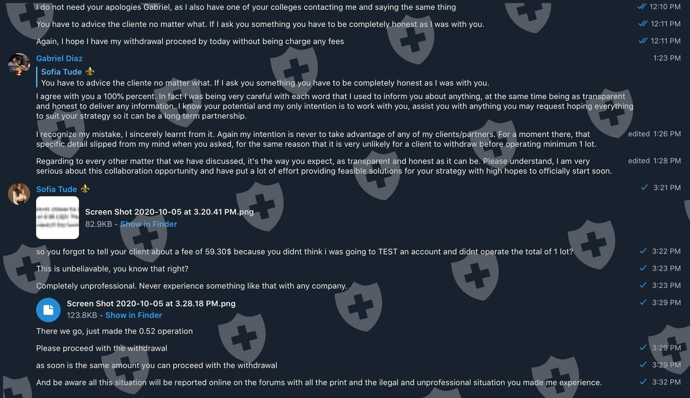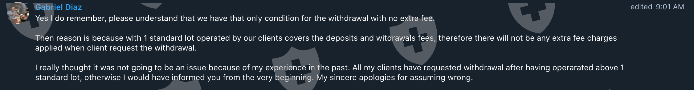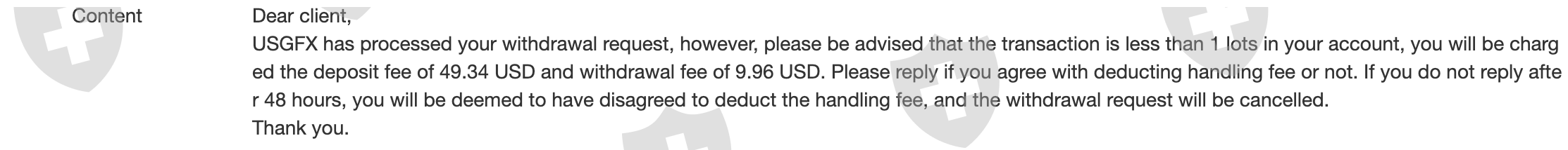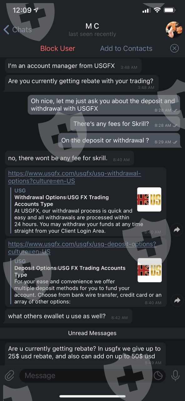 The most unprofessional and ridiculous situation I had with a broker. I was contacted by Gabriel Diaz, a business manager in USGFX, an UK broker regulated by FCA and VFSC, to test their account and open a MAM account. He induced me to deposit 1000$, where before i made de deposit i asked about the fees to deposit and withdrawal the answer was 'Theres no fee' ( following the screenshot from our conversation ). Well, i made the deposit and was no fee; i operate on their platform who use plugins agains costumers and when i request the withdrawal came the surprise. I was being charge a deposit fee of 49.34$ PLUS a withdrawal fee of 9.96$, total of 59.30$. BIG SCAM EVER. Will never operate on this platform again and never recommend to anyone. Shame for such a new broker. For my surprised i was also contact from another guy, Mike, via Telegram which i asked the same question, just to make sure about the fees. Following their answer.There we go all the pictures so you guys be aware of this UNPROFESSIONAL broker and team =)