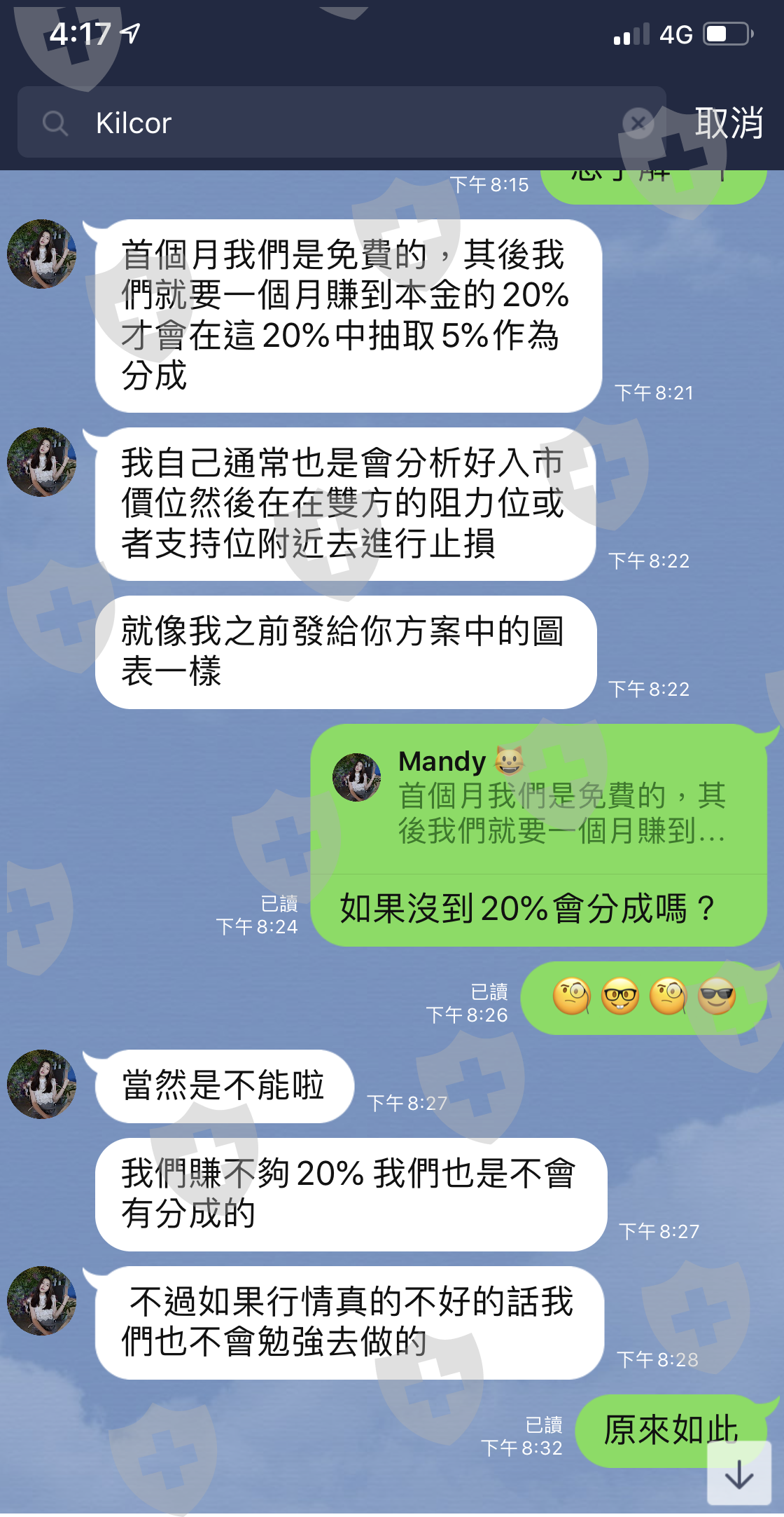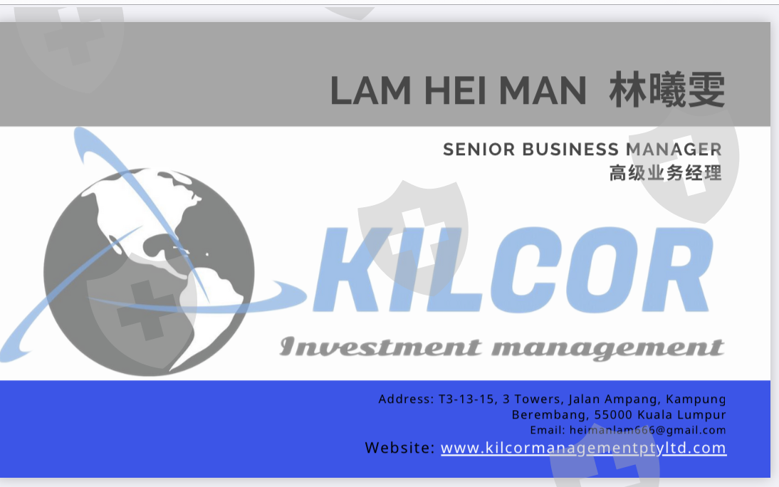 Mandy於Omi交友軟體告知為在馬來西亞工作的香港人,名片為林曦雯高級業務經理。以操作USDJPY商品投資方案,以朋友閒聊取得你信任後,每日生活照和吃飯照片來跟你聊天,並給你看她操作獲利,要你去借款給她操作。首先方案是先把你入一筆50萬台幣資金,幫你操作獲利到達20%後,再請你入真實資金到對方香港銀行,以來領取20%獲利。起初獲利第一筆20%有拿到,但之後隔一個月後再告訴妳新的方案要推出,要妳再去借貸來取得這波疫情的黃金大行情的操作,第二個月帳戶獲利提醒她我要出去金,她卻不給出金,而且MT4帳戶無法登入且為帳戶無效,並告訴你她使用對沖策略來幫你賺取高報酬獲利,至今從7月到10月未拿取到二筆獲利,也無法登入MT4帳戶,我不斷告訴她我一定要出金,她僅告訴你銀行審查嚴格,要你一直等待下去,資金被卡在香港匯豐銀行。我也懷疑她是詐騙,她也一直用她們公司是合法正當的營運來解釋,說如果是詐騙早就不理會你。經查kilcor為一家澳大利亞投資公司,但投資項目無forex,以及新加坡政府也說該公司無合法監管,該Mandy林曦雯經理人不短強調他們是正當合法公司,但卻是一場騙局。請大家務必勿在交友軟體參與任何投資項目。因為就是詐騙。Address :T3-13-15, 3 Towers, Jalan Ampang, Kampung Berembang, 55000 Kuala LumpurWebsite: https://www.kilcormanagementptyltd.com Email: cs@kilcormanagementptyltd.com