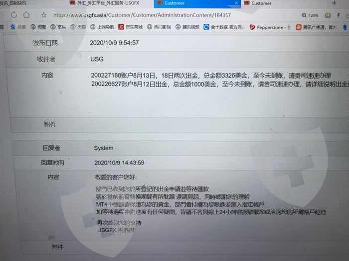 Usgfx联准国际,从8月12日出金至今两个半月了,一直未到账,照会,官网客服,客户经理,邮件多次催款,但是一直以各种拖着。