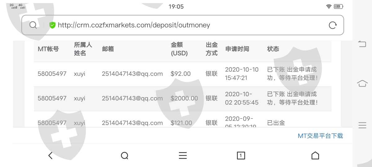 我从十月二号出金到现在没有到账,COZFX就是一个骗子券商!