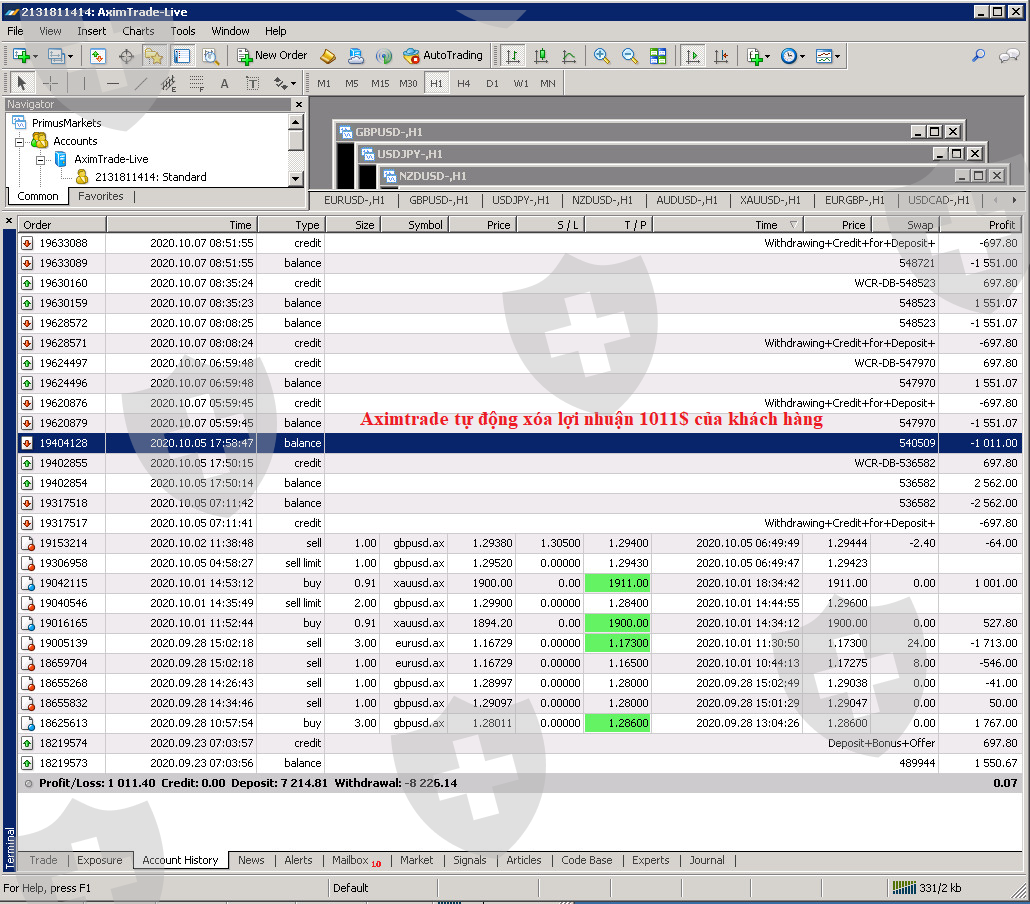 Tôi tên Nguyễn Hồng Sơn, có nạp 1550$ lên sàn Aximtrade.com để giao dịch (My Mt4 : 2131811414 ) , họ cho tôi tham gia promotion nhận 697$ bonus, nhưng khi tôi giao dịch có lợi nhuận 1011$ , Aximtrade vu khống tôi đã đăng nhập trùng thiết bị với tài khoản nào đó và thông báo không công nhận kết quả giao dịch, họ xóa 1011$ lợi nhuận của tôi. Trong khi đó , những khách hàng khác cũng tham gia và thua lỗ hết 1500$ , sàn cũng báo trùng thiết bị nhưng họ không hủy kết quả lịch sử giao dịch thua lỗ. Rất nhiều khách hàng đã cháy tài khoản nhưng sàn đều công nhận kết quả giao dịch thua lỗ, còn khách hàng có lợi nhuận đều không rút được tiền lãi.Tôi khẳng định sàn Aximtrade là 1 sàn ôm lệnh, sàn được thành lập với mục đích lừa đảo, đưa ra các chương trình promotions để lừa khách nạp tiền vào, nhưng sẽ không thể rút được tiền. Mọi người đề phòng cẩn thận trước khi nạp tiền trade đối với sàn Axim trade.Tôi mong sự giúp đỡ của cộng đồng để có thể lấy lại được lợi nhuận hoặc Aximtrade phải trả lại tiền thua lỗ của khách hàng khác.