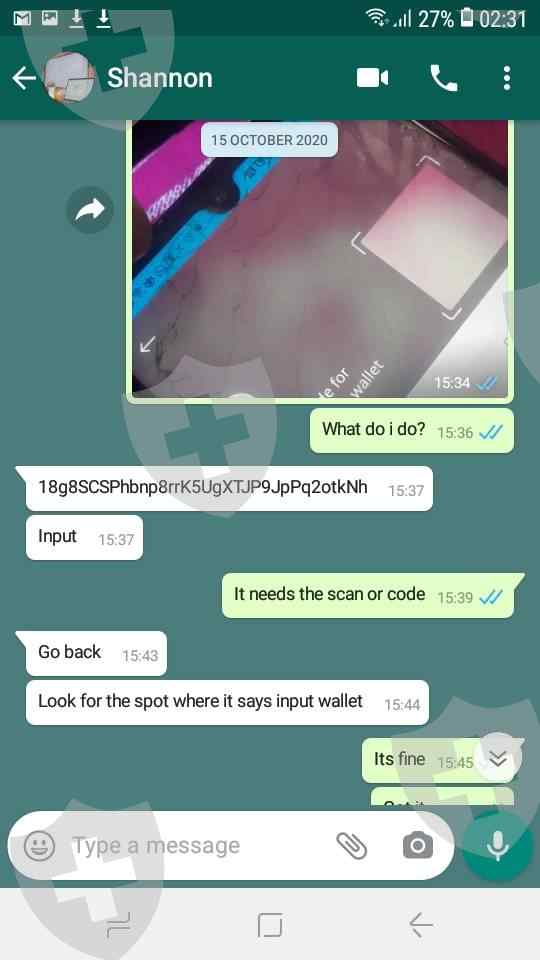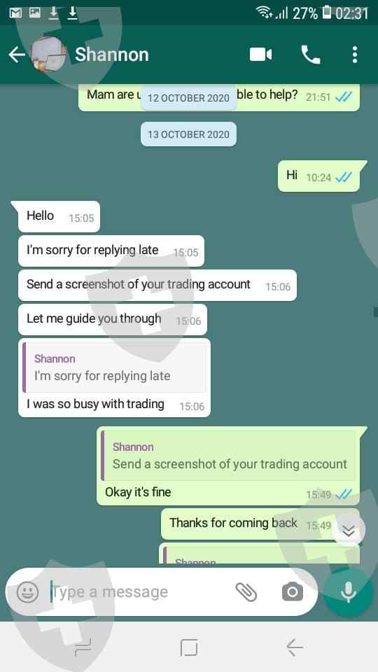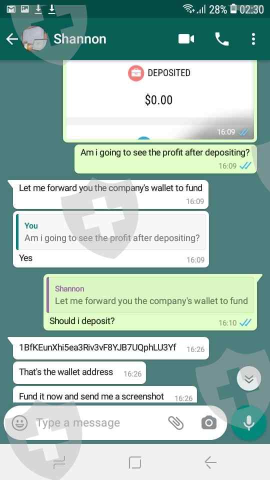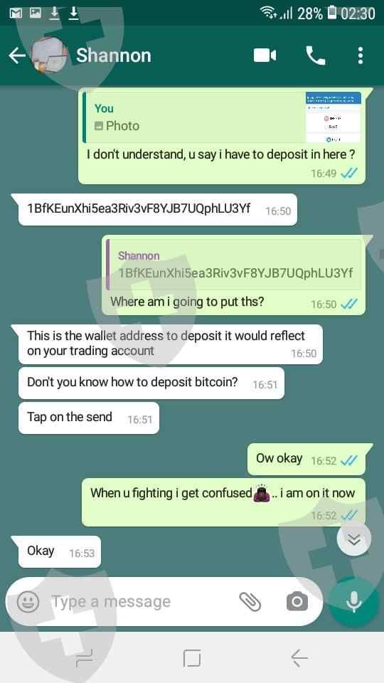 she said she is going to trade for me, i sent her R1500 to her what she called management wallet, thereafter, she said it's going to take 24 hours to get my profit, her name is Shannon and she didn't help me on withdrawing, thereafter she said my time for withdrawal is over i have to purchase the coins of R500.. that's when she disappeared.