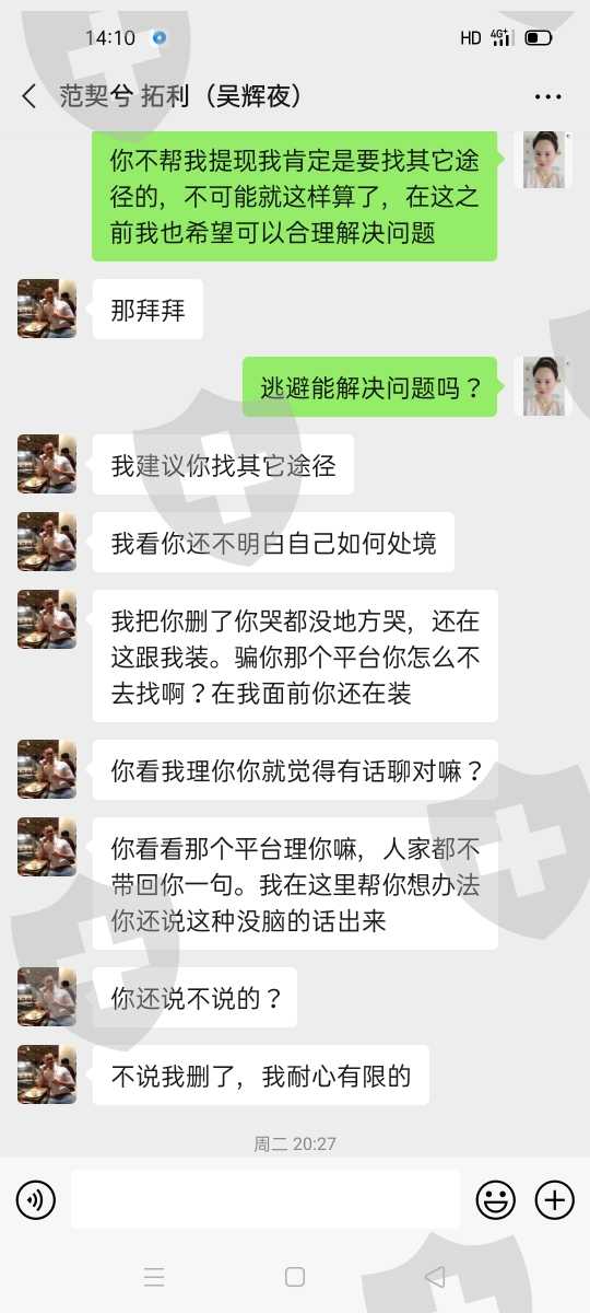 大约是9月初的时候一个微信名叫范契兮的陌生微友加我微信,他说他叫吴辉夜是在深圳开公司的,是拓利外汇的平台代理,还说他们是专业的分析师,帮客分析数据赚佣金,很多客户都找他们投资,说他们的专业能力能让客户放心,还说这个周期短!盈利高。24小时都可以操作最关键是随时提现!我问他有没有风险,他说没有风险,还说资金都是由NFA负责监管的!骗我在平台上充值了8000美金,提现的时候提不出来,之后还说资金太少一直催我多凑点充进去,我说凑不到了就把我的账户给销户了