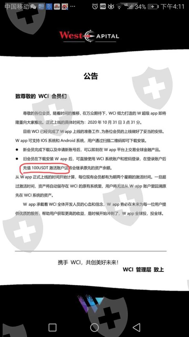 wci无法提现还要我们充值一百美金到所谓的WApp激活费