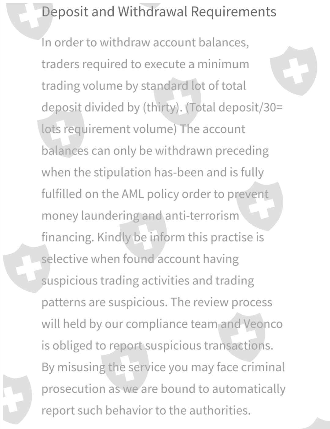 他们制定了一项名为“反洗钱政策”的政策,这将使您极难达到交易量,以确保您在提取资金方面遇到困难。表示如果您存入1000,那么您需要交易1000/30 [3d] 33.333手