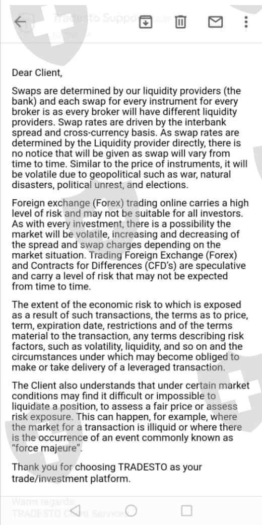 这是诈骗!隔夜利息(swap) 突然变成300+usd! 重点是我只开0.01手!这是我在2020年头在Tradesto 发生的,询问broker时他却把责任推给银行(如图四)0.01手隔夜利息怎么可能在一夜之间变成300+usd!大家小心这个broker,主要活跃在马来西亚各个大学里,专找大学生下手!他们以组织来拉人,名为CK Limited 和 Big Brain Bank,然后Tradesto是他们的合作broker。大家要小心Tradesto, CK Limited, Big Brain Bank!
