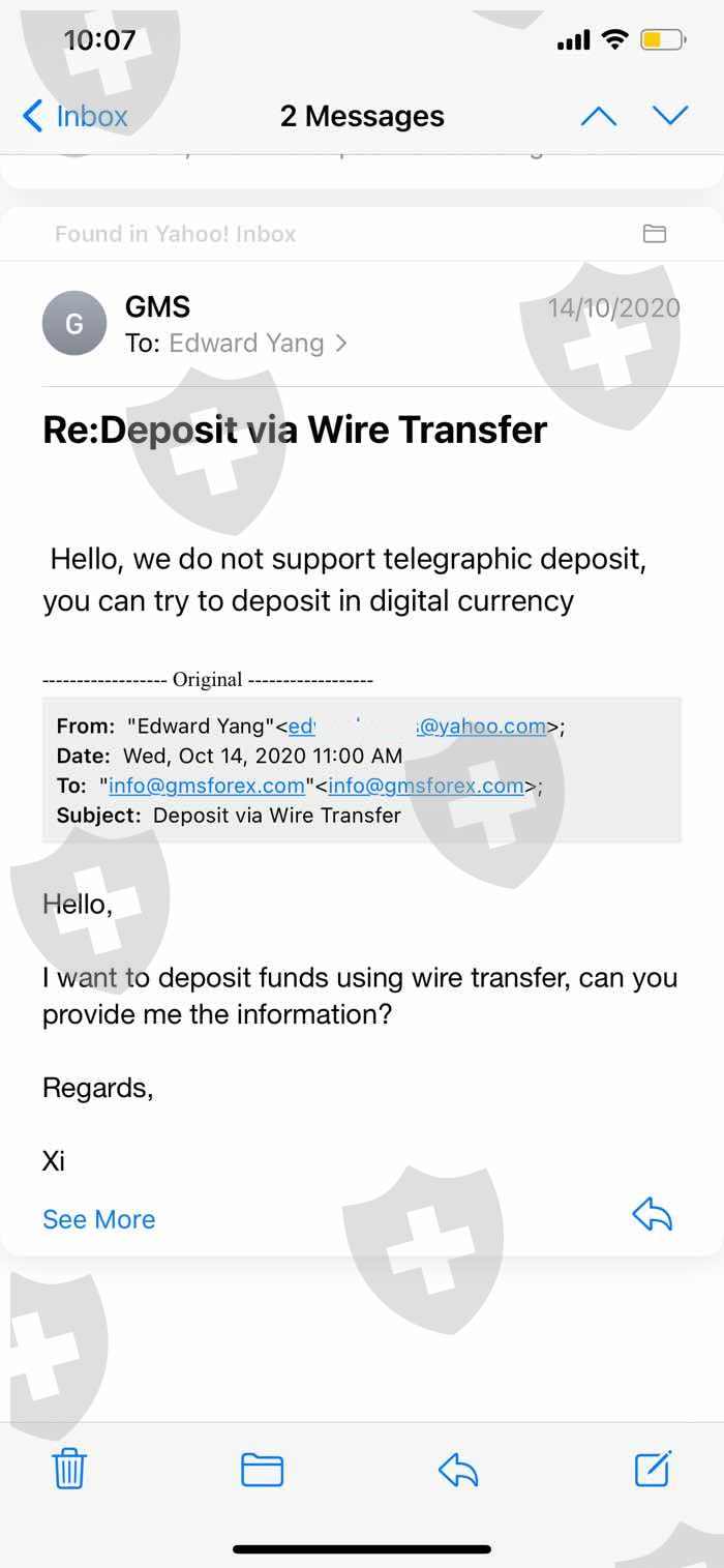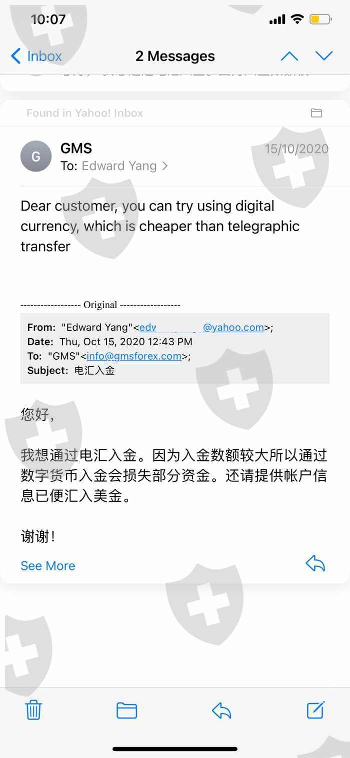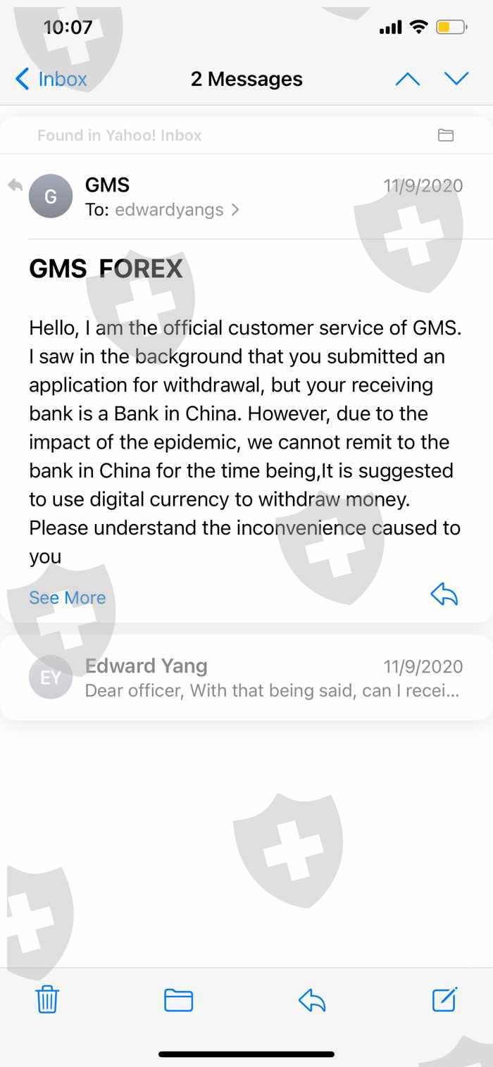 一个陌生中国女孩介绍我用的外汇交易平台。她一直劝我用虚拟货币入金,实际上GMS工作人员的邮件也称只接受虚拟货币。数周前我的MT5账号上显示的市场不再波动,才发现账号可能被冻结了,GMS的登陆界面也无法加载。