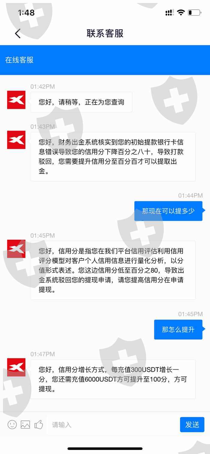在XT B提币,被客服告知违规操作洗黑钱要验资,验资要充币,充币金额为账号余额的55%的保证金,不然就会被封号。交好之后提币,又被告知账号信用分不够不能提币,问客服如何完成信用分,客服再次告知还得充币,当时怀疑被骗,信用分问题就没再充币,之间与XTB客服联系好几次,现在连XTB系统都无法登入,这情况已经是第三天了。