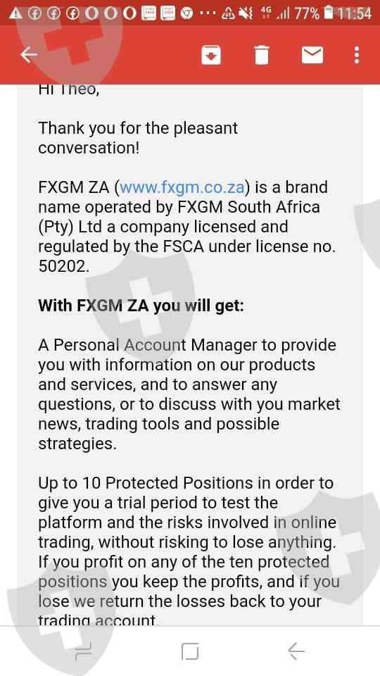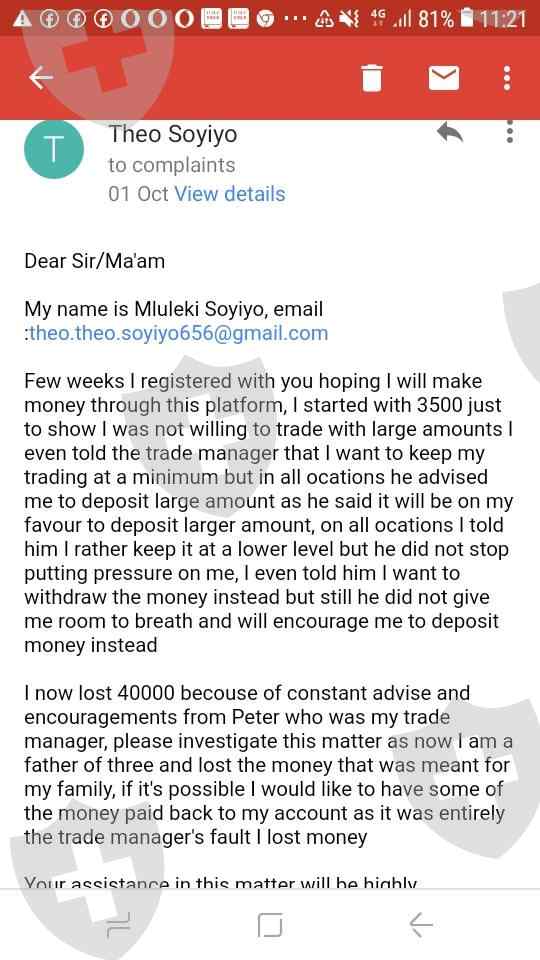 计划中的R3500最低转为R43500亏损。FGM不遵循自己的政策,他们招募了经验不足的交易员,并利用自己的专业技能欺骗并说服他们在获得最低存款后增加了资本,假装对新交易员来说是“有利的”头寸“受保护” [3b],但是您最终失去了一切,Sulav cs与我联系,并将我也交给了Peter。我给他们发送了一封有关我的经历的电子邮件,但他们忽略了我。