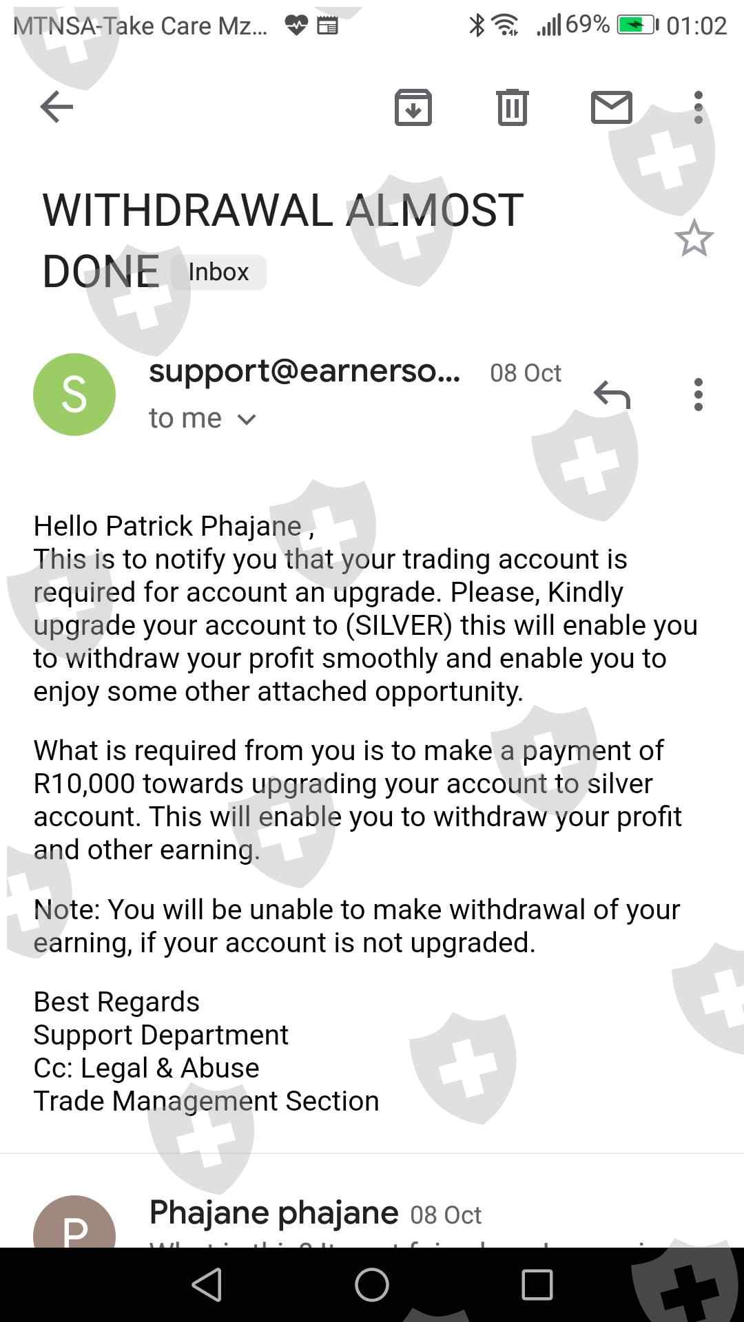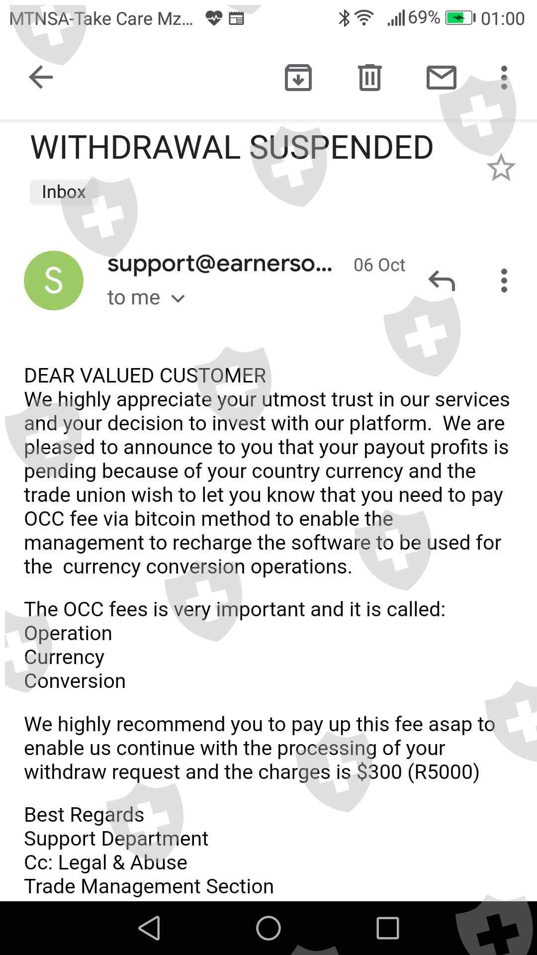 在注册过程中获得收入的人无法解释费用和级别升级。我存放了所有R7000,在提款期间我收到第一封邮件,说我必须支付R5000的OCC费用。在提款过程中,他们发送第二封邮件,以支付R10 000进行级别升级。我意识到自己被骗了