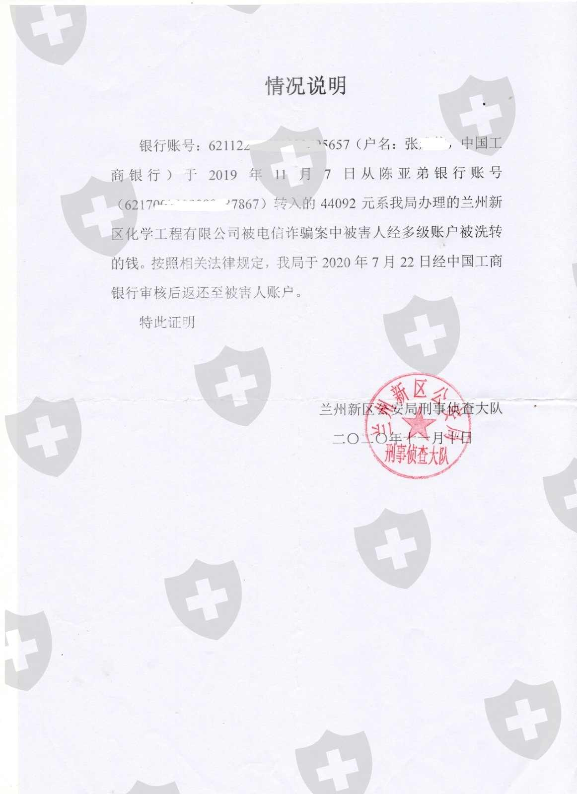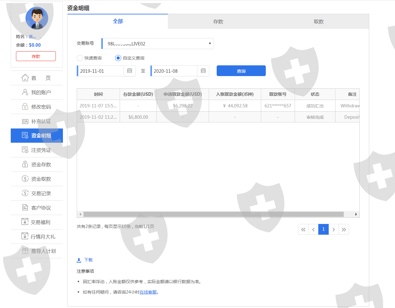 我的账户资料和入金出金流水明细:(请看截图),第一入金,我于2019年11月2日入金:6800美金,折合人民币48184,入金到平台的个人账户:张冬香,账号:62290********89738(银行细中标注:入金)第二出金,经过交易后,尝试出金(交易亏损一部分)于2019年11月7日办理出金6298.22美元折合人民币:44092元,出金到我自己的工行账户:621226********95657,平台是通过户名为:陈亚弟的银行账号(62170********87867)于2019年11月7日汇款44092元(银行明细中标注:出金)第三账户被冻结,我的银行账户在收到陈亚弟的44092元后立马被兰州警方冻结。(牵涉刑事案件)第四,警方依法划扣陈亚弟给我的汇款44092元(银行提供依据,兰州警方出具证明),第五,平台期初让提供证明出金为非法资金,后来当我经过从郑州到兰州千里索证后,又开始甩锅,声称,不怕投诉,不怕你报警,更不怕你打官司,摆出一副天下之大,谁也不怕的姿态!!!总结:人家是大公司可以不怕投诉,也不怕警察调查,更加不怕中国的法律----因为皇御环球是国际大公司!