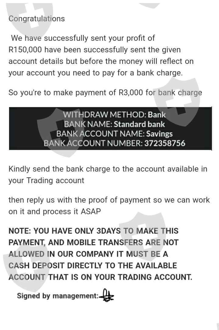 I was also scammed by Forex Cryptotraders. They use Facebook to advertise their trading. I was to told to deposit R500 and I will receive R5000 in three days. Same day after I deposit it reflects R3000. After three days I change to R150 0000. They told me I was one of the Lucky winners. They told me to deposit R3000 inorder to receive my 150K. I said to them the reason I invested R500 just because I don't have money. They keep on saying Mem and I am he. Please help to catch them.