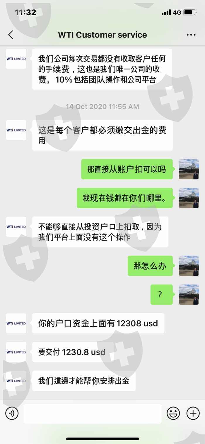 当我提出出金问题时。该公司客服告知要还10%服务费。我就提问从利润扣除,但是该公司说不可以从利润扣。而且WTI要我承担12308的10%1230。我就质问我的利润才4000的10%400为何要还全额。他们公司说这不是他们的问题。