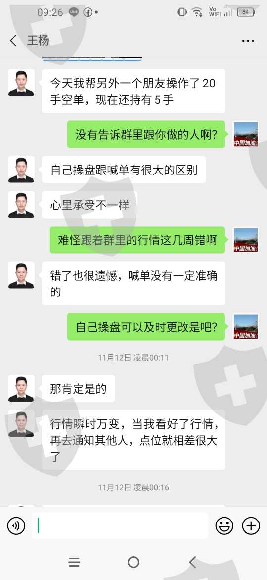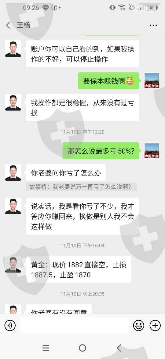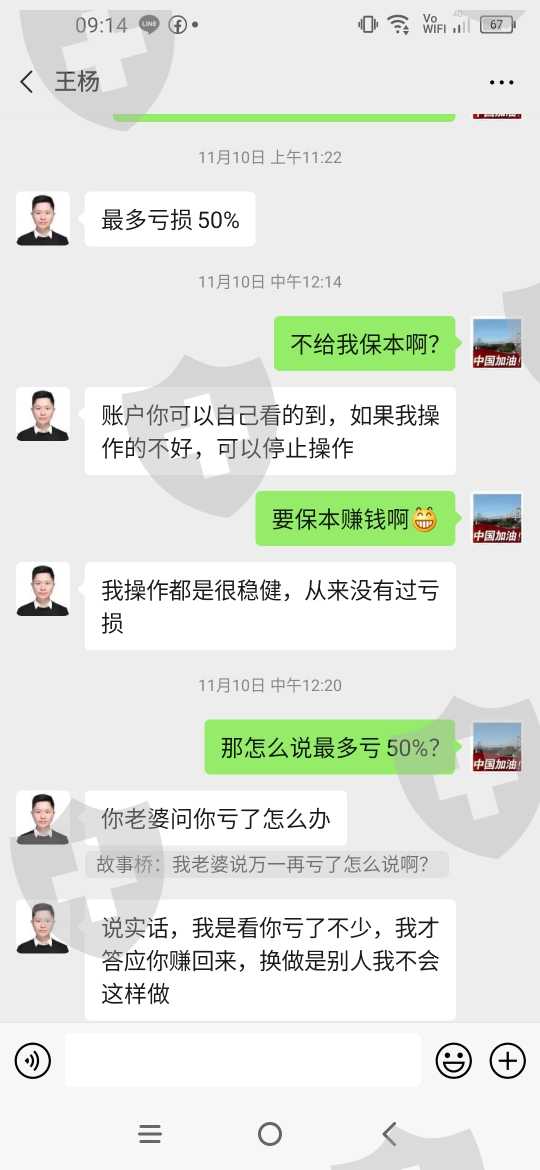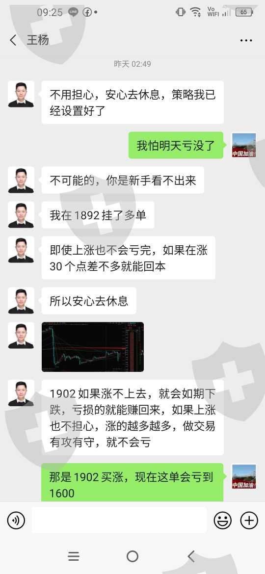 曝光平台分析师王杨,在操作我账号的时候说保证不会亏损,结果做了4天亏损3天,把赚钱的单拖到亏钱才出。以前的错误行情让我爆仓亏损很多,我操作有问题,他给我的行情错误太多占很大原因。感觉他在故意亏我的资金 ,让他操作的很多单本来是可以赚钱的,到最后都是亏钱给我卖出去,根本就不想一个专业的操作