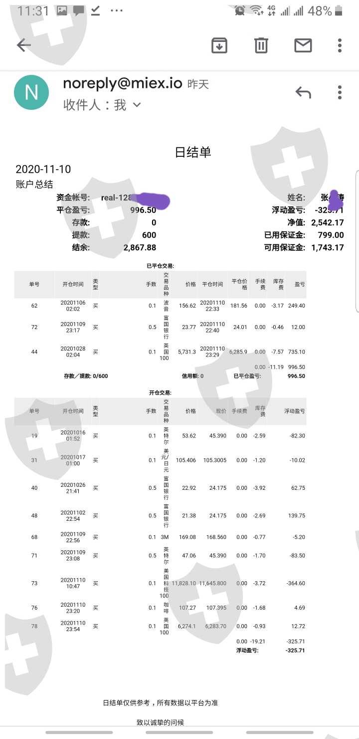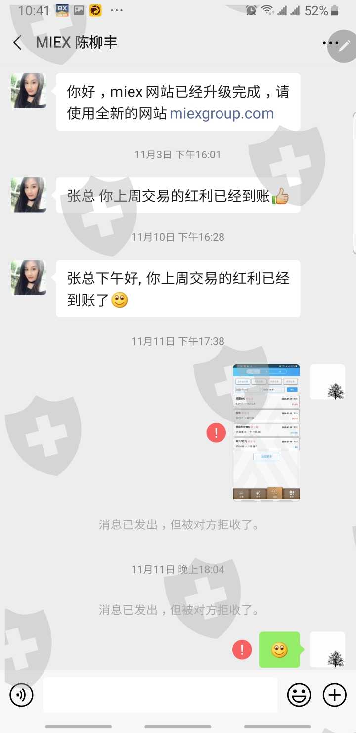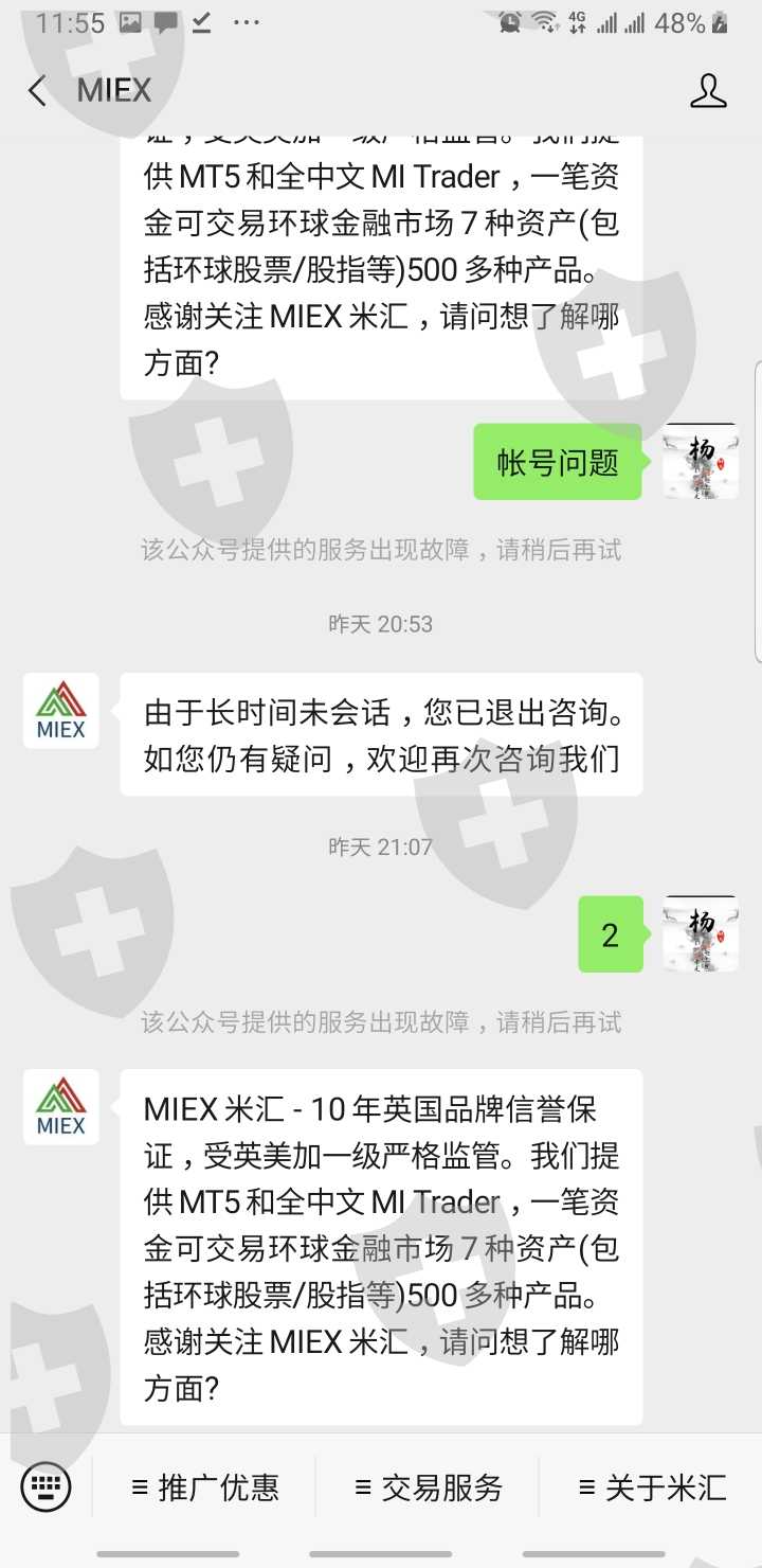 我于MIEX米汇2020年10月14号开户入金。2020年11月11日,MIEX 手機平台17:31时,4个交易被系统强制平仓,保证金充足)。后与微信客服经理联系,拒绝收我的微信消息(拉黑了)。再与在线客服,QQ客服联系,都没有得到有效回复。 18:00左右,帐号登录异常显示:“网络异常,请稍等再试。“ 一周了,每天都与客服联系,都未得到回应。