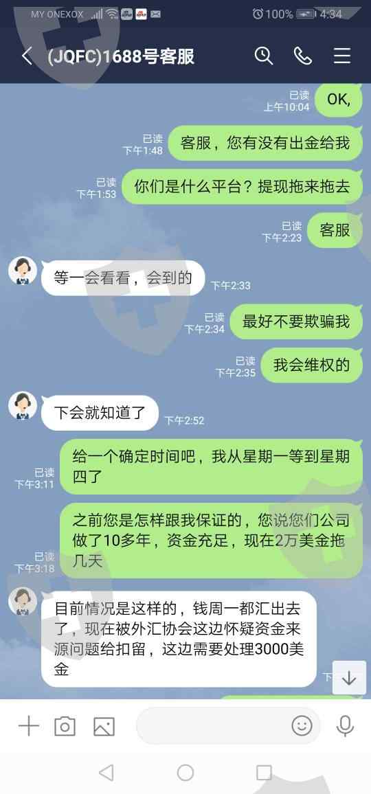 欺骗说已经出金要1-3工作日会收到,3天后又说等到下午,最后说已经汇款了,被外汇协议怀疑扣留,要交3000美金才能解决问题