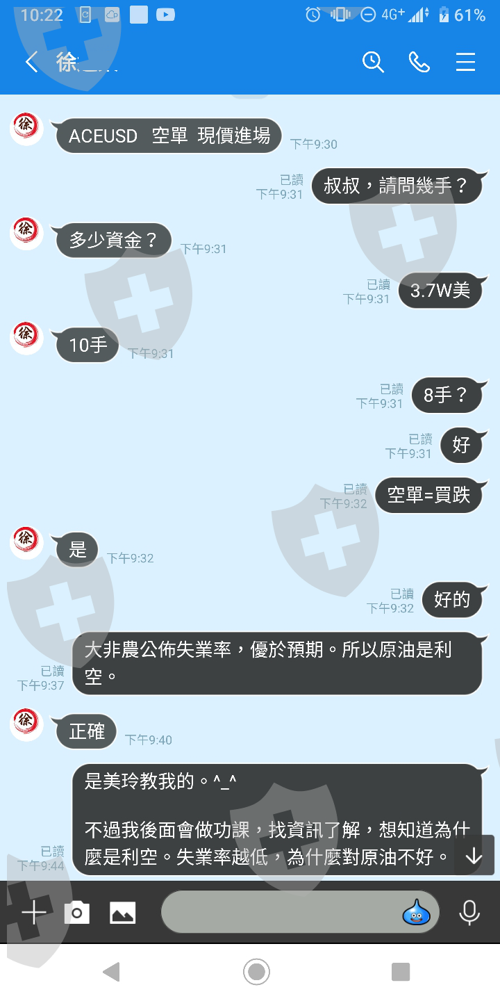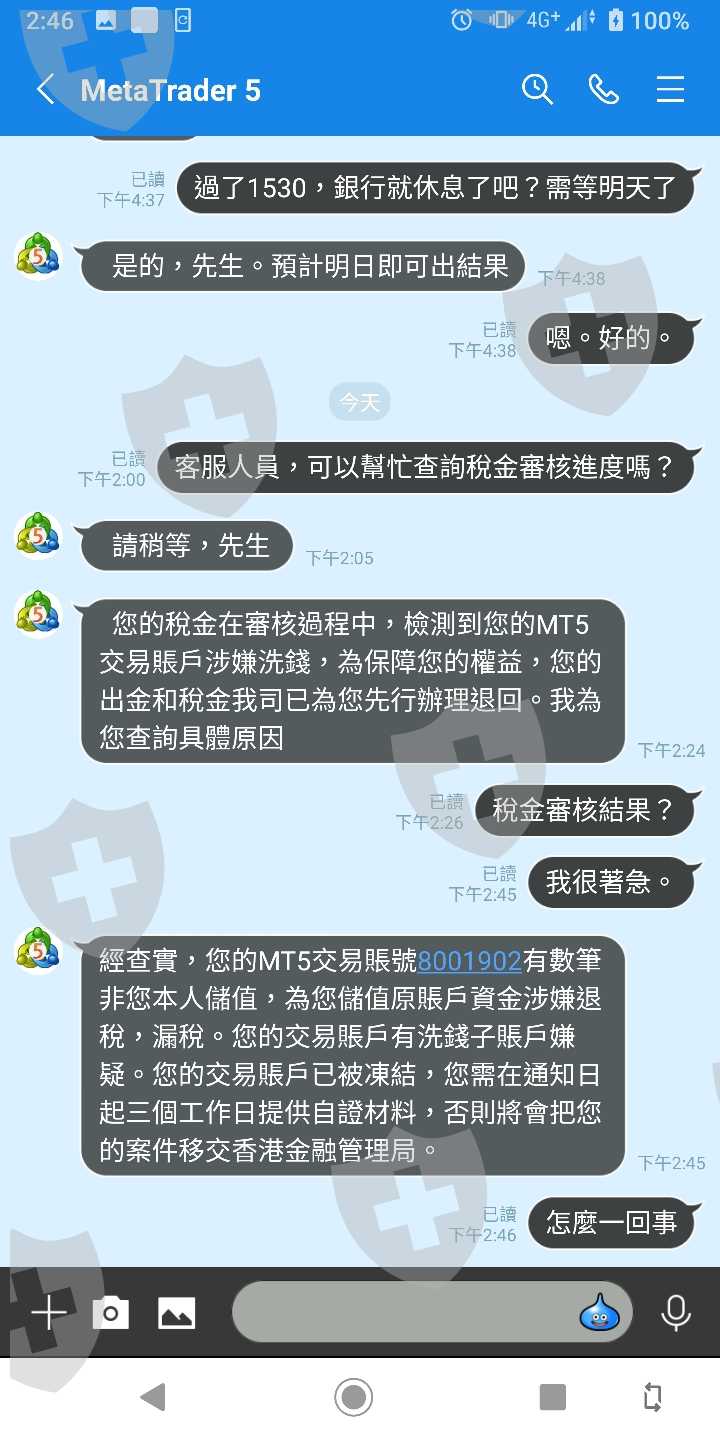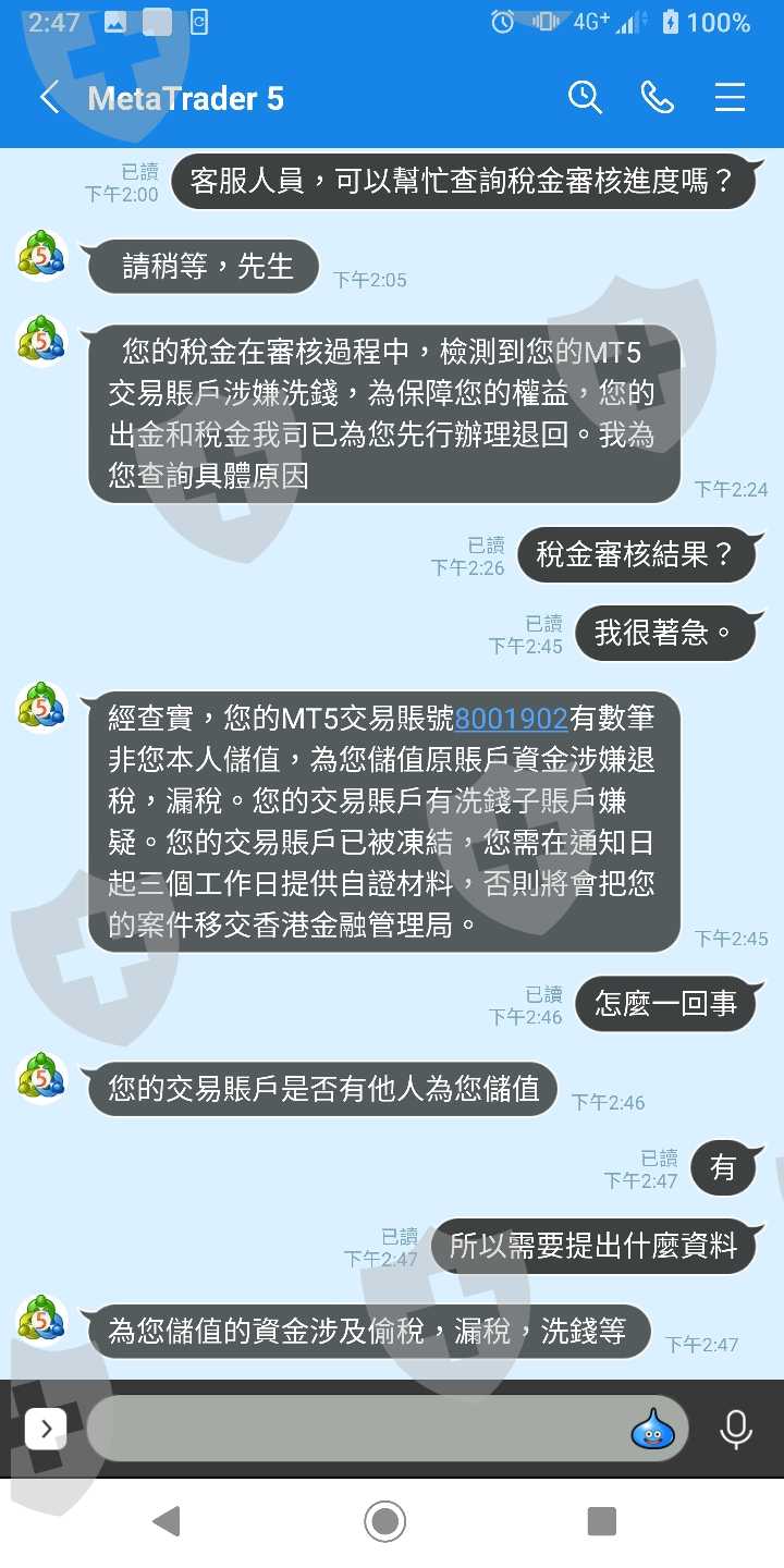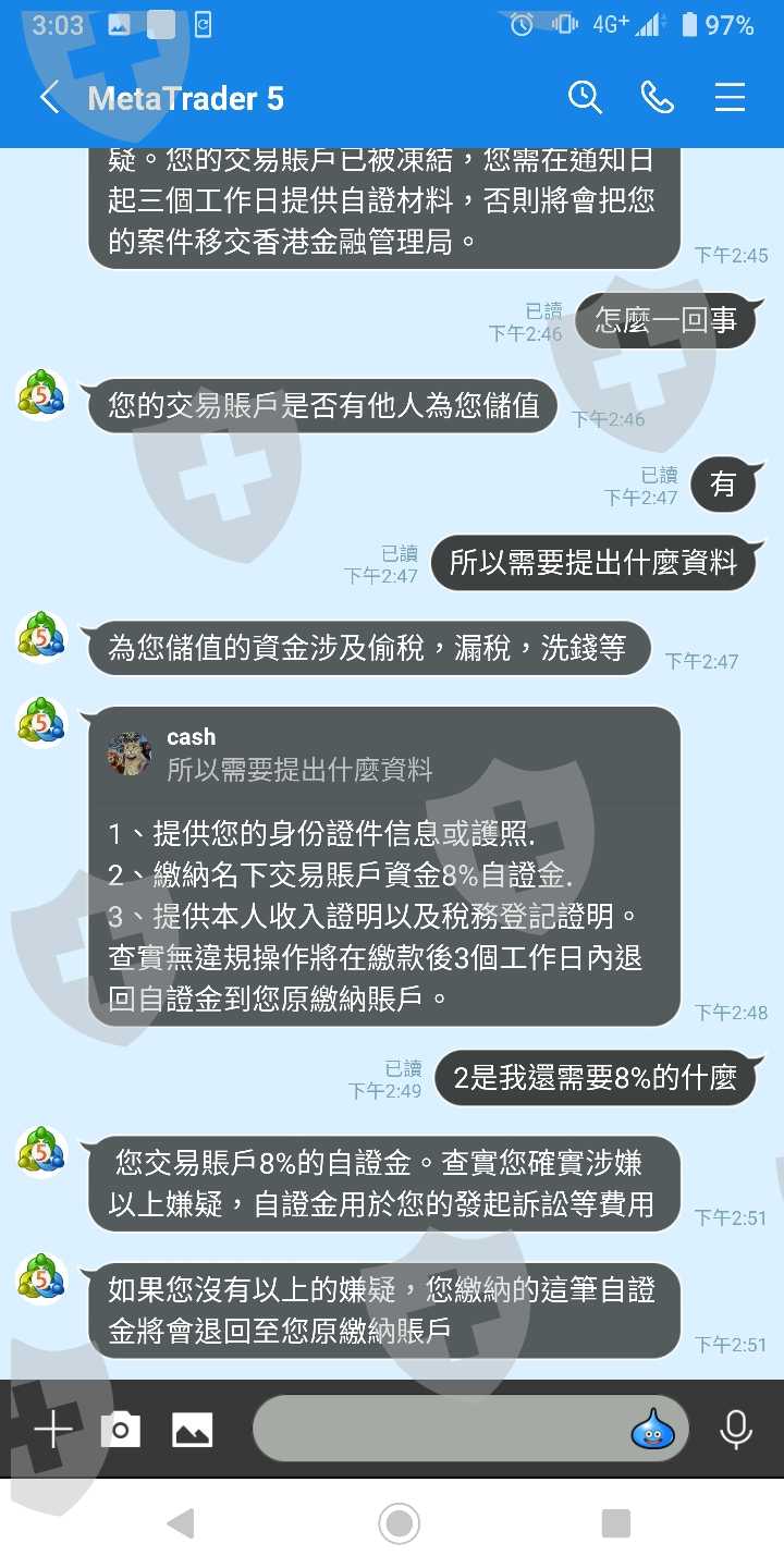 在九月中,交友網站認識一女以及引薦她的叔叔徐XX(因為尚未確認真偽,所以名字先保留)。鼓吹投資理財,一起投入資金,操作MT5,主要操作金融商品是ACEUSD。跟著她叔叔進場出場,獲利很可觀。直到我出金累計到3000美,就被通知要繳稅金,配合之後,又被通知資金流向有問題。後面女才說她資金有一筆是朋友資助,是黑錢,她正在報警處理。而我向客服討香港金管局公文,看起來不對勁。我寫信問香港金管局,金管局說是沒這回事。顯然是遇到詐騙了。我跟那女要她報警的報案單號來證明她不是詐騙一員,但遲遲不給,也漸漸不回應。我要去報警備案了。