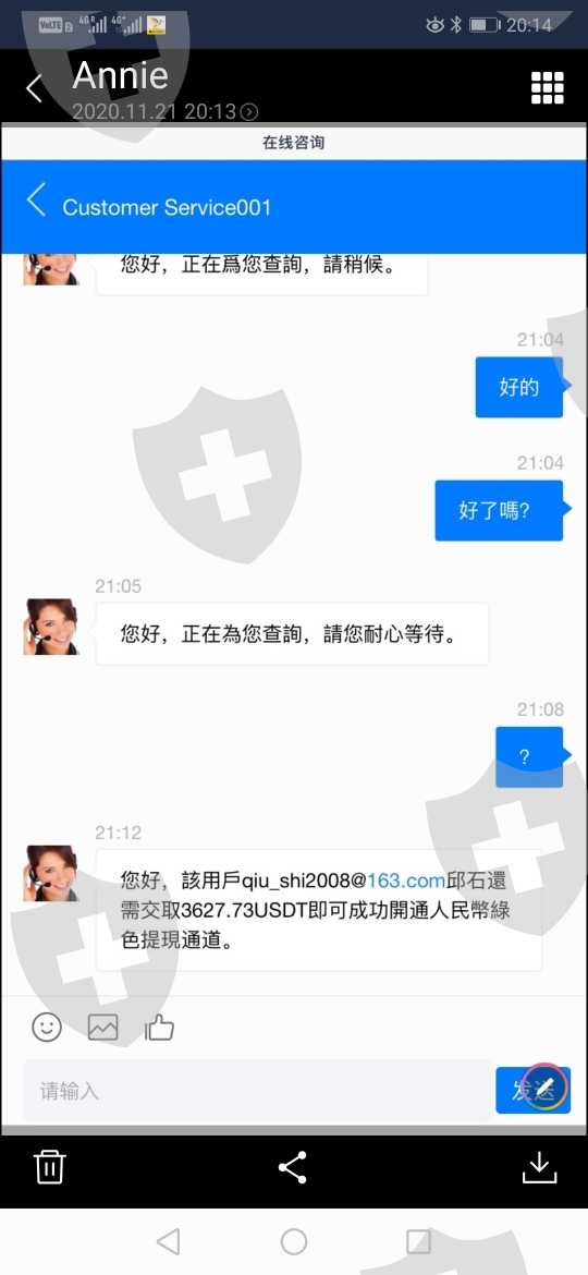 客服说必须打入5000USDT开通人民币通道才能出金,按照客服要求打入5043USDT,客服说不行,必须是5000USDT,让重新入金。感觉这个平台就是黑平台!请国际刑警督察此公司!没有监管的平台!