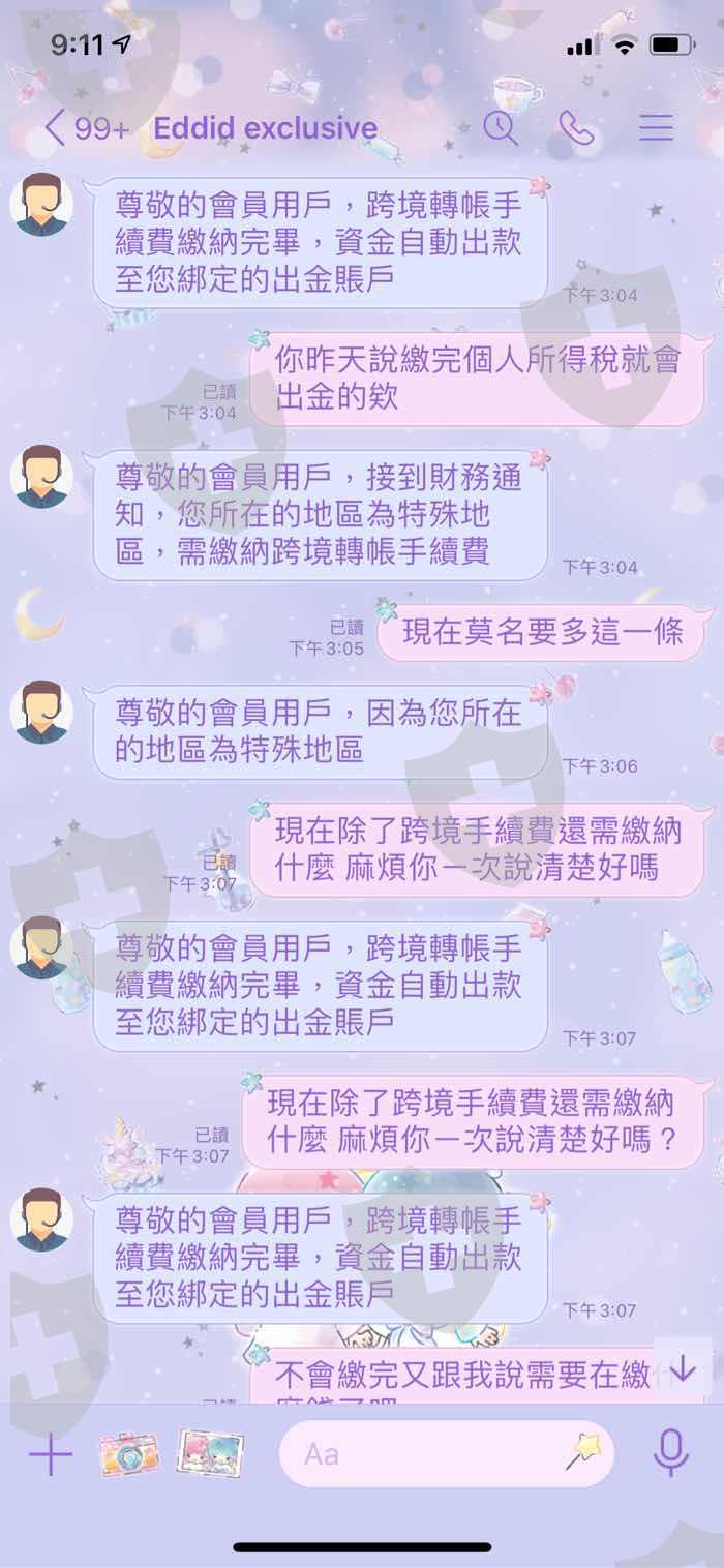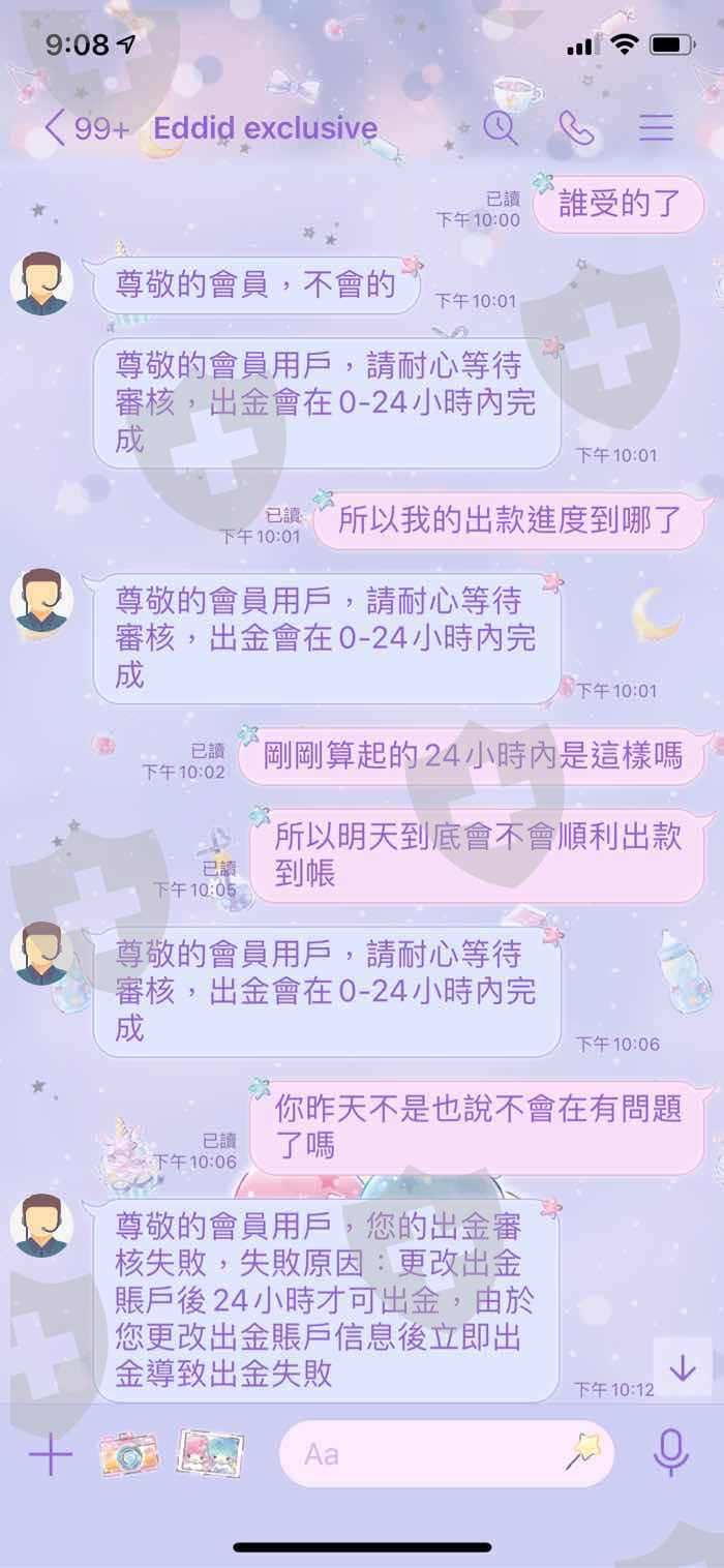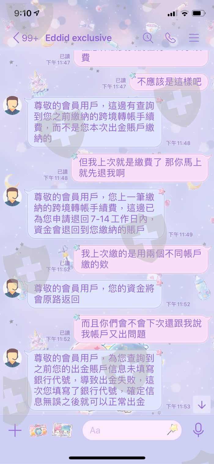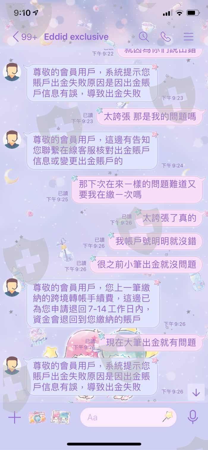各種不讓出金~每次申請都是出金失敗然後誘導我們重新在按申請出金 重新按申請出金後 平台直接凍結我帳戶說申請過多次出金造成帳戶異常要繳納6萬平台幣才能解凍 我覺得根本被詐騙了 重點我該繳納的個人所得稅跟誇境轉帳手續費都繳了也不退我錢現在全部卡在裡面 他們實在有夠過份 欺人太甚