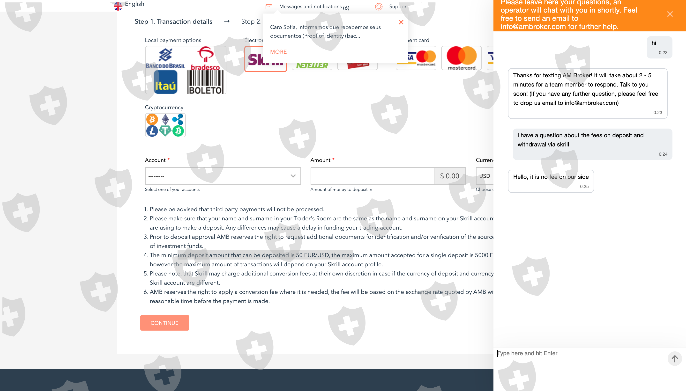 我存款前问过是否要存入任何费用,支持团队回答不。存款后,我开始交易,每笔交易都有很大的滑点和执行时间。显然,他们使用插件。好吧,我去取钱了,并惊讶地收到1%的NOWERE费用。我通过skrill USD存入资金,当我去提款时,我有(当然)唯一的选择,而且与我提款的货币不同,还有1%的手续费。我去了实时聊天,以澄清和完全浪费时间。可笑的实时聊天。他们根本就不知道自己的工作,也不会帮助解决问题。再也不,不要在这家公司上存款。诈骗!!!!!