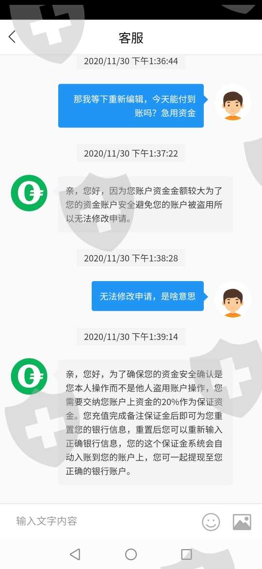 因提现银行输入错误,申请修改银行账号,需要向平台缴纳提款金额20%的保证金,方可修改银行账号,而后才能提现,且保证金和利润资金一起提现。