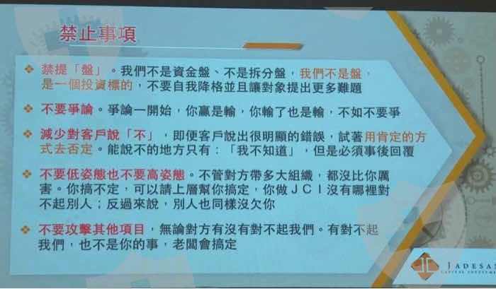 連小姐稱她只是台灣市場講師,但領導人們分分蒐集資料,證據含括說自己是股東,甚至可以直接對接中國跟新加坡領導股東,甚至台灣財務都由她處理,等等證據實在無法是一個單純講師所為,據內幕消息,此人長年做策劃賣給一些國家進行詐騙,有時躲在後面未露臉,所以前面安全下莊幾次後,不知騙不夠飽,於是大張旗鼓把JCI引進台灣騙台灣人一波,而此人之前活躍於杭州,這次返台做JCI目的為何?嘴上說要處理都是推託,聯合新加坡人騙台灣人,據領導人發出消息台灣吸金金額到達1000萬美金,受害人數2000-3000人,甚至5月底不出金,繼續推出2.0/3.0等,更打著另外一個外匯師馬里奧團隊繼續行使詐騙收單,可惡至極。以下為她上課投影片,以及當初大群流出訊息,證實根本資金盤,並非正規公司,完完全全利用英國公司牌照海騙台灣一群人,此女惡劣更要脅眾多投資人,如果告我便將組織圖提供讓你們一個都跑不掉,更處處污衊投資人領導人,造成大家分裂無法一起提告訴,目前已經有人馬提告,檢調調查中,希望此女這次未詐騙付出代價。