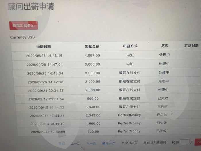 我的客户在USG入金操作,产生了14097美金的佣金,我在9.14号申请出佣金,9.24号全部申请被取消,并且没有经过我的同意,于是我在9.24跟9.28再次申请出佣金,到现在已经一个多月,依然没有到账,接近十万人民币,这是我用客户的本金刷出来的佣金,USG却迟迟不给!