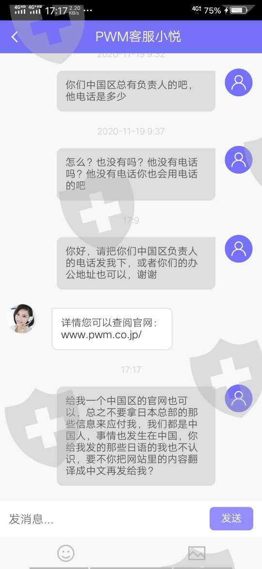 在2020.10.30日联系客服入金,10.31正式在PWM平台进行操作,最后在交易完要提现时客服以我银行卡号错误为由让我交保证金还有身份证和银行卡照片,客服说可以帮我改正银行卡号信息,交了保证金后还是提现不成功,客服又告诉我信用分下降等理由阻止我提现,但我是在交了保证金后并且信用分百分时申请提现的,平台没理由也没道理不给我提现到账的,于是我要求客服给处理我的出金问题,但最后客服告诉我要等11月末平台结算时才可以,直到11月19日客服还在说让我等月末,但是当我11月22日再与客服联系时,直到今天12月8日,客服也都没有任何回复,我的本金17万多就这样销声匿迹,被他们骗走了,本以为可以改善家里的生活质量,结果现在还要还信用卡还贷款是雪上加霜,请看到我消息的友人们帮忙转发,不要让其她人再受其害,同时也请相关部门能够帮忙严查PWM JAPAN PWM日本证券这个平台,可以帮我们讨回公道,让他们还我们血汗钱,让中国的国民再免受这些平台的欺害!