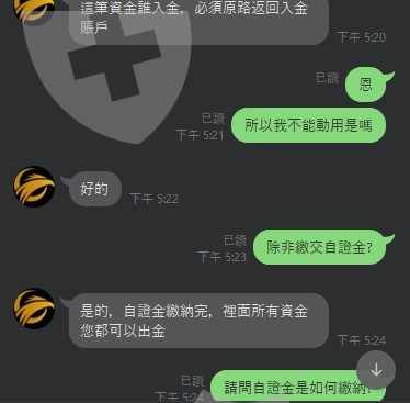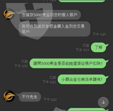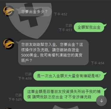 自己跟他人都有入金到個人帳戶 這筆錢是個人投資損失 他人入金到個人帳戶補償 我想出金卻遭到拒絕 懷疑洗錢 無法出金 還需要再匯款入金5000美元才能動用個人帳戶內所有資金