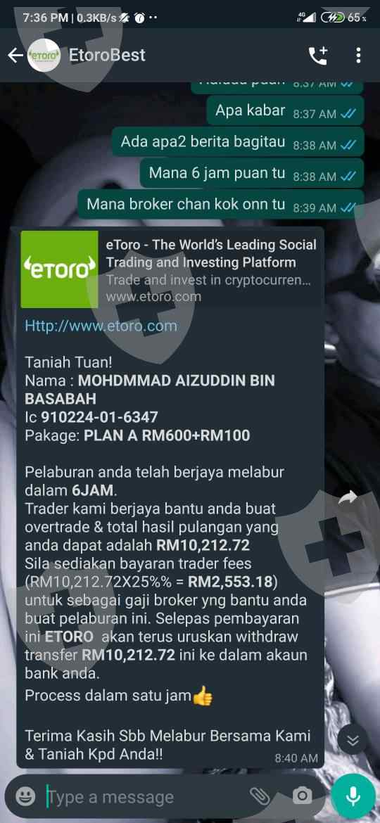 该经纪人没有要求任何预付款,并承诺在6小时内可以直接取款。但是,她没有及时通知我,并以附件屏幕截图的形式发给我,我需要一些现金才能进行转账流程。这是骗局,我损失了大约600令吉的现金。因此,我决定曝光此平台,大家当心,某种骗局仍然活跃。