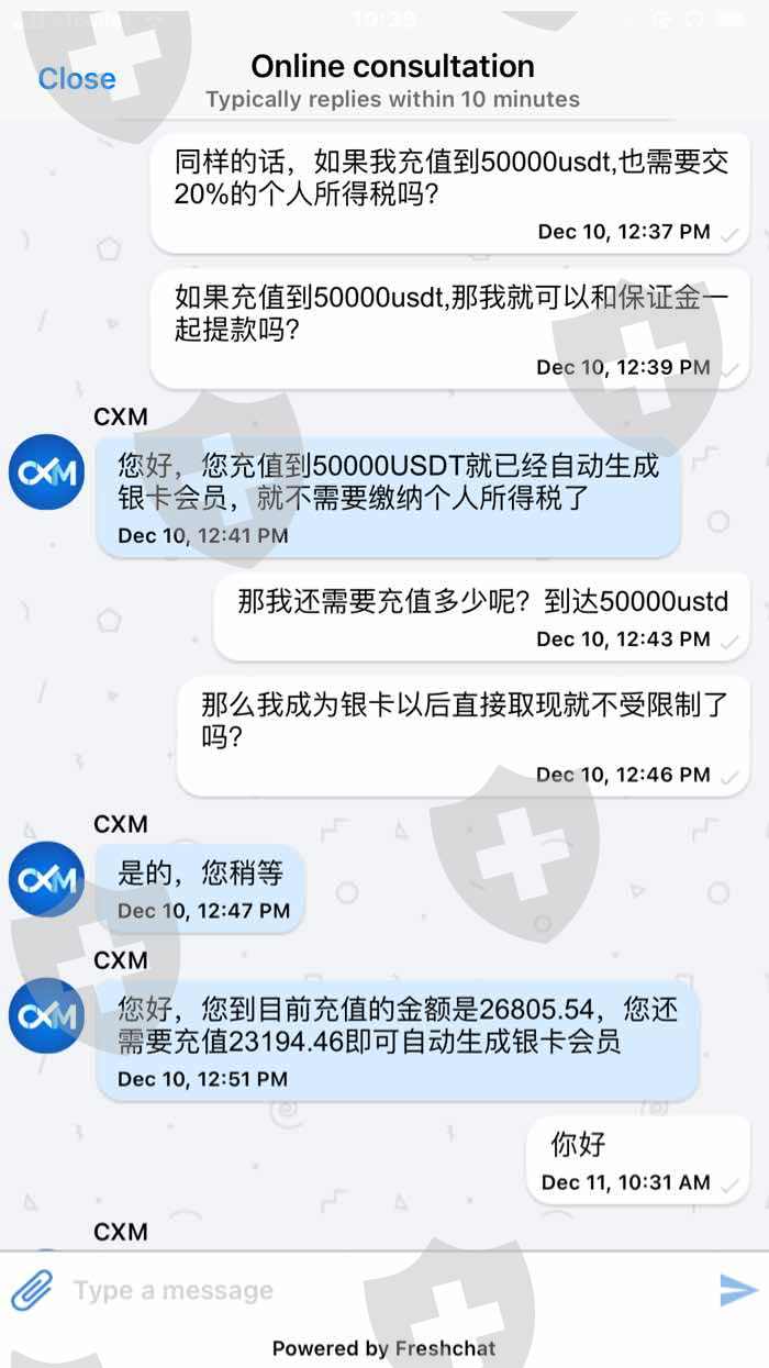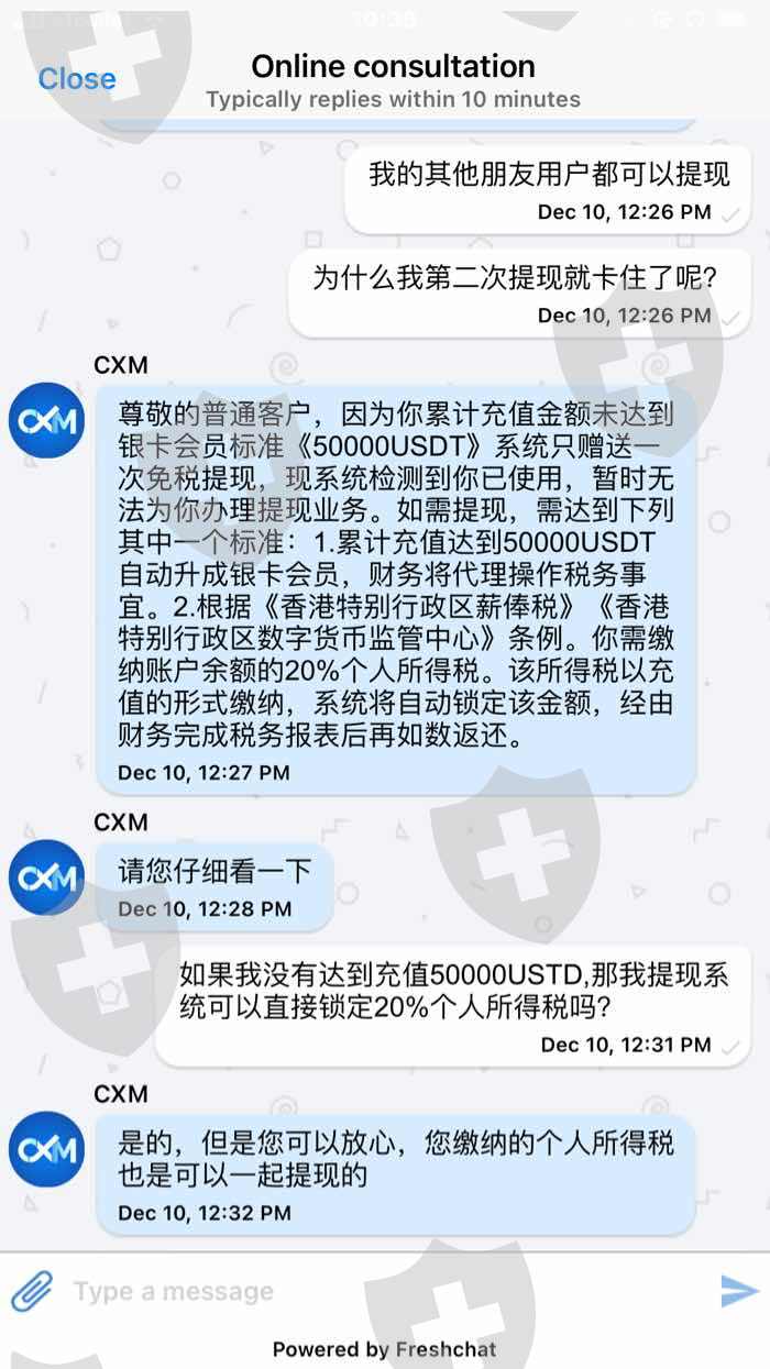 最近在在CXMarkets 平台入金,在不知道的情况下,第一次可以出金,但是到了第二次出金就遇到困难了,客服要求充值达到他们的银卡标准,要么就交20%的税,最后才能完成财务报表才能出金。