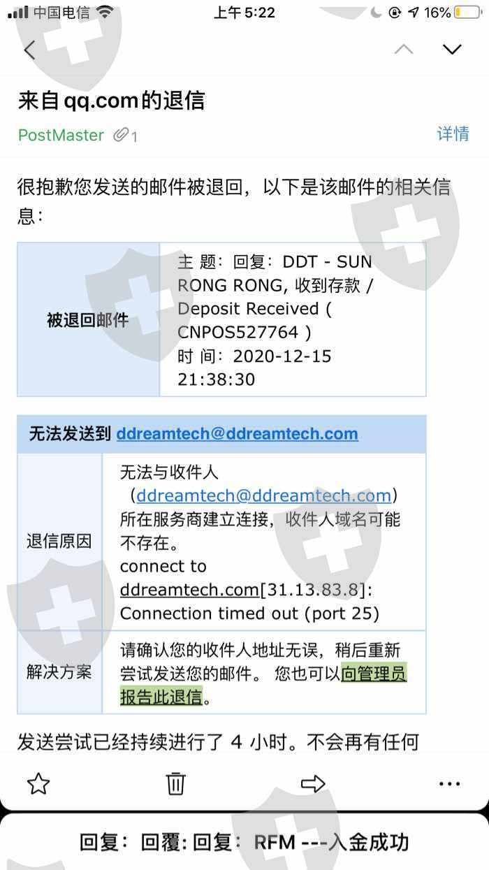 当初入金的时候发来邮件的邮箱,现在居然都不好发送邮件难道是DDT外汇平台在搞欺诈?