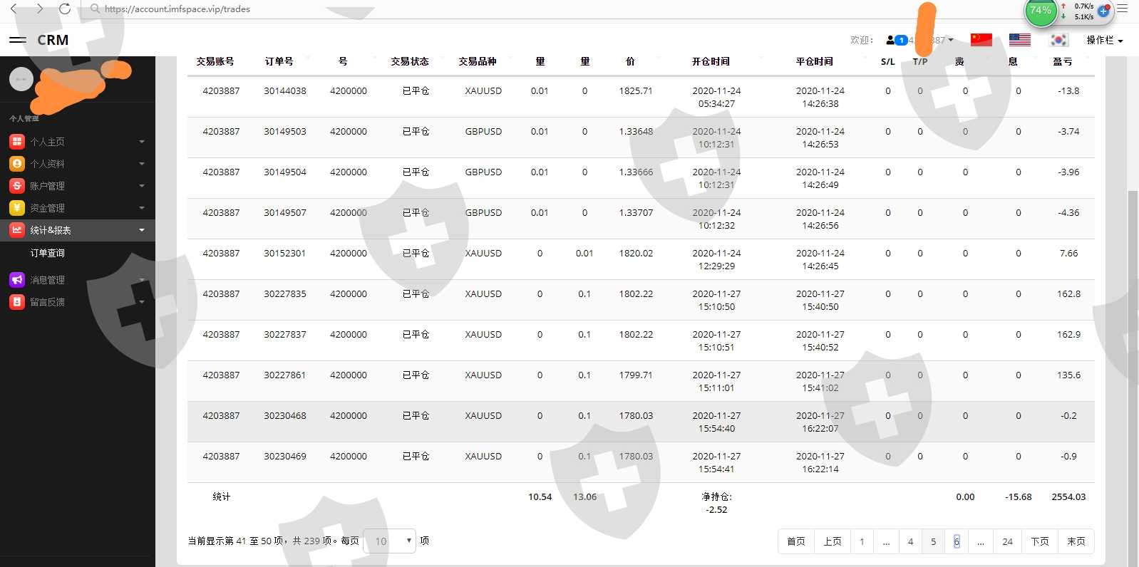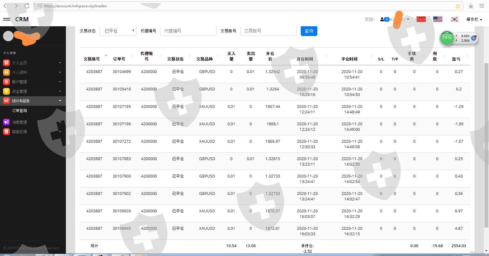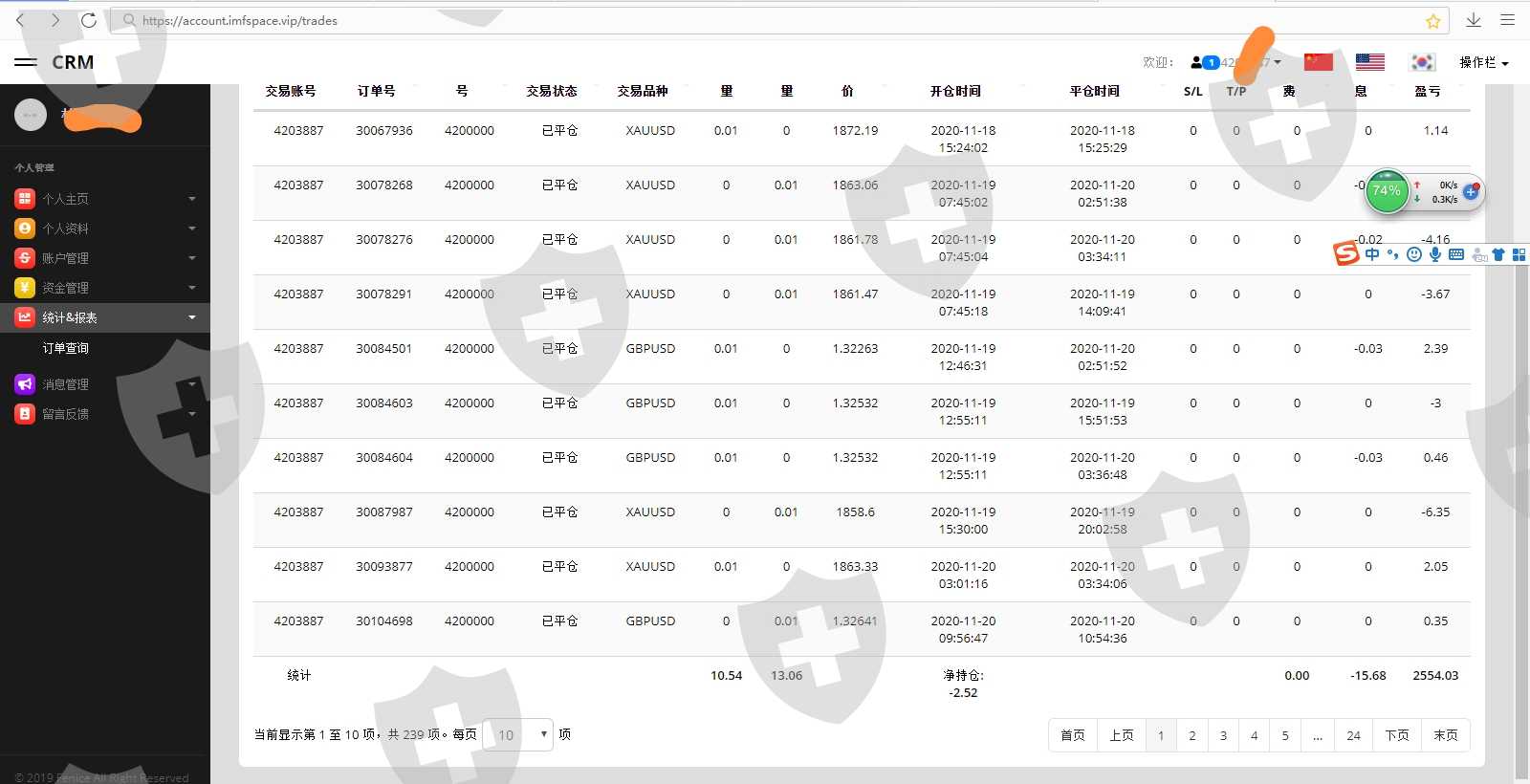 在IMF平台开户后,在2020年11月18日、11月26日分两笔合计入金2398美金,做单两百多笔后,盈利2538美金。