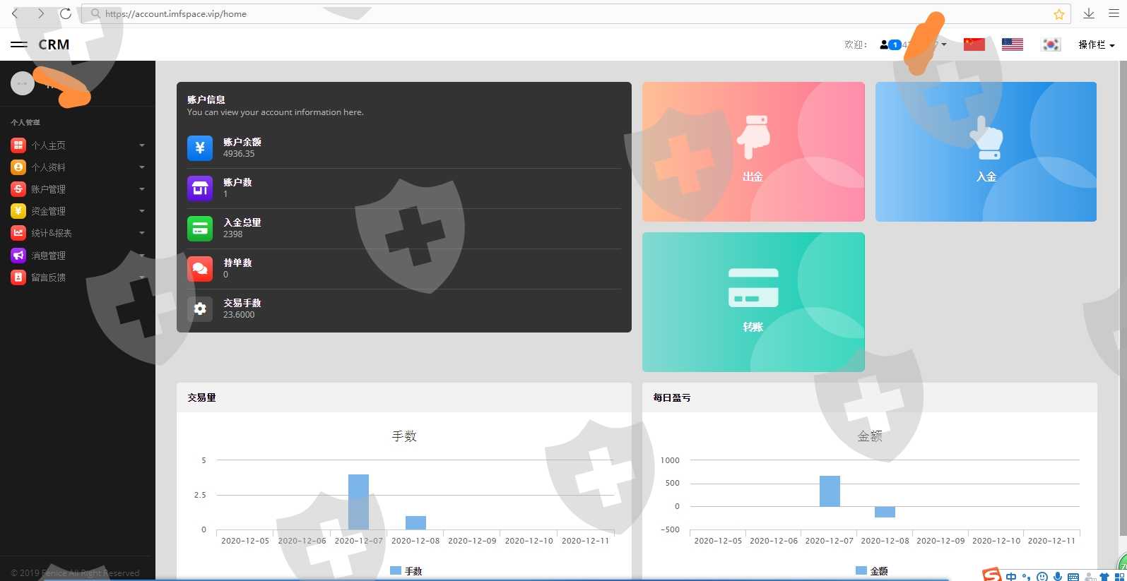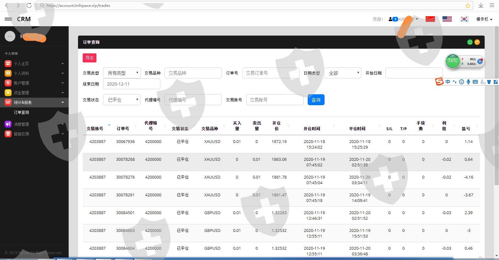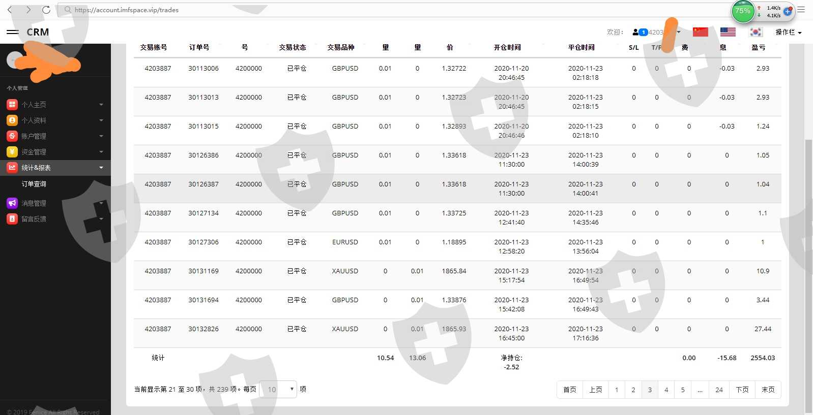 在IMF平台开户后,在2020年11月18日、11月26日分两笔合计入金2398美金,做单两百多笔后,盈利2538美金。