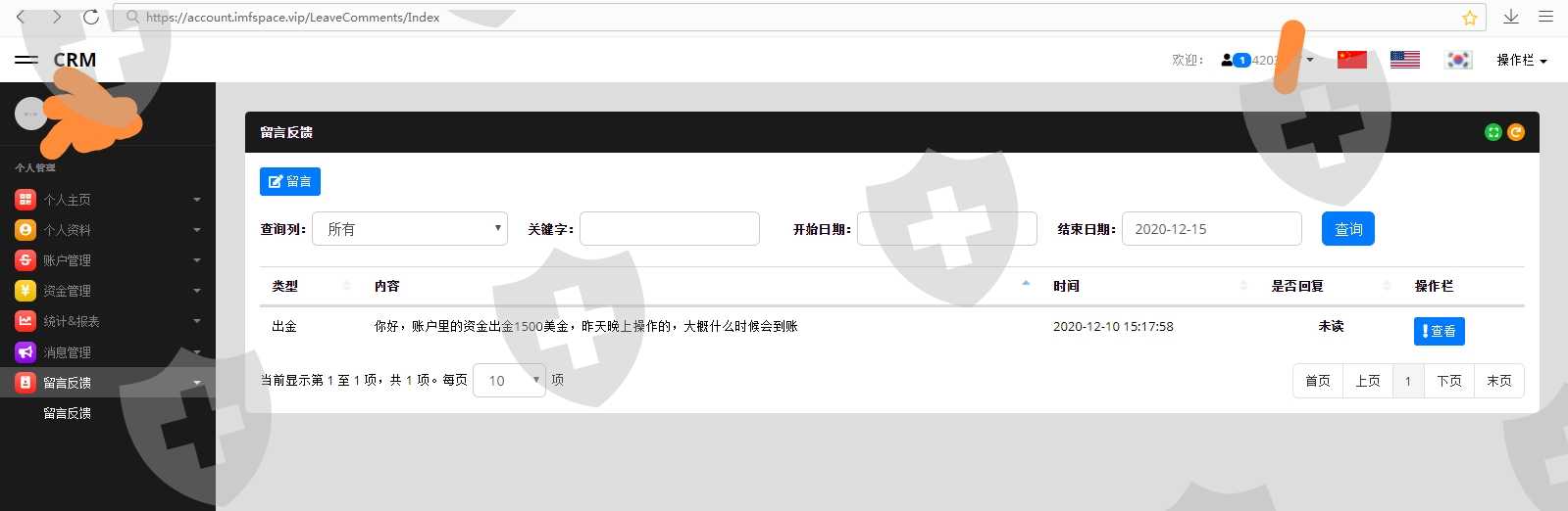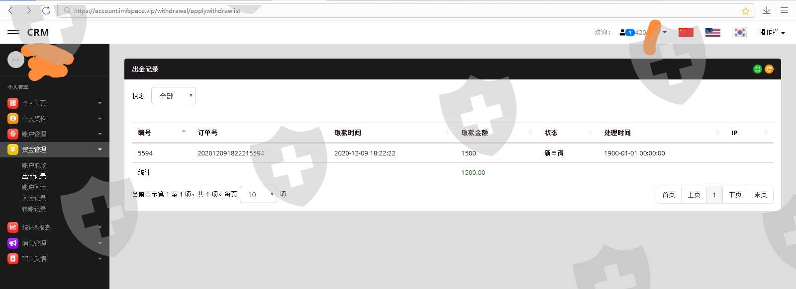 于2020年12月9日申请1500美金出金,网站上提示24小时内到账,可是过了几天账户里的资金没有出金1500美金的扣款。