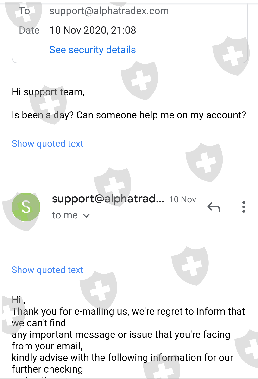 这家交易商从11月9日开始突然间mt4帐号有问题不能用,过后我尝试到我的登入帐号看看什么问题,才发现我的登入帐号也不能登入了,尝试了几次,帐号就被锁了。一开始我尝试了官网的客服,可是从来没有人回覆的,后来尝试了官方邮件,11月12日还有回覆我说是务器有问题,他的团队正在修理。后来就没人回覆了!11月9日到今天12月16日,我的账号都还不能用,我刚刚也尝试打电话过去 (+41 315 281 429), 也是没有人接听!一家交易商需要那么长的时间来修理服务器吗?这家交易商还说会提供24/7的客服服务,可是过去一个月天从来都没人回覆我,是不是要跑路了?我现在只想把我帐号里的钱都提出来,因为这家交易商的客服太不靠谱,感觉好没安全感