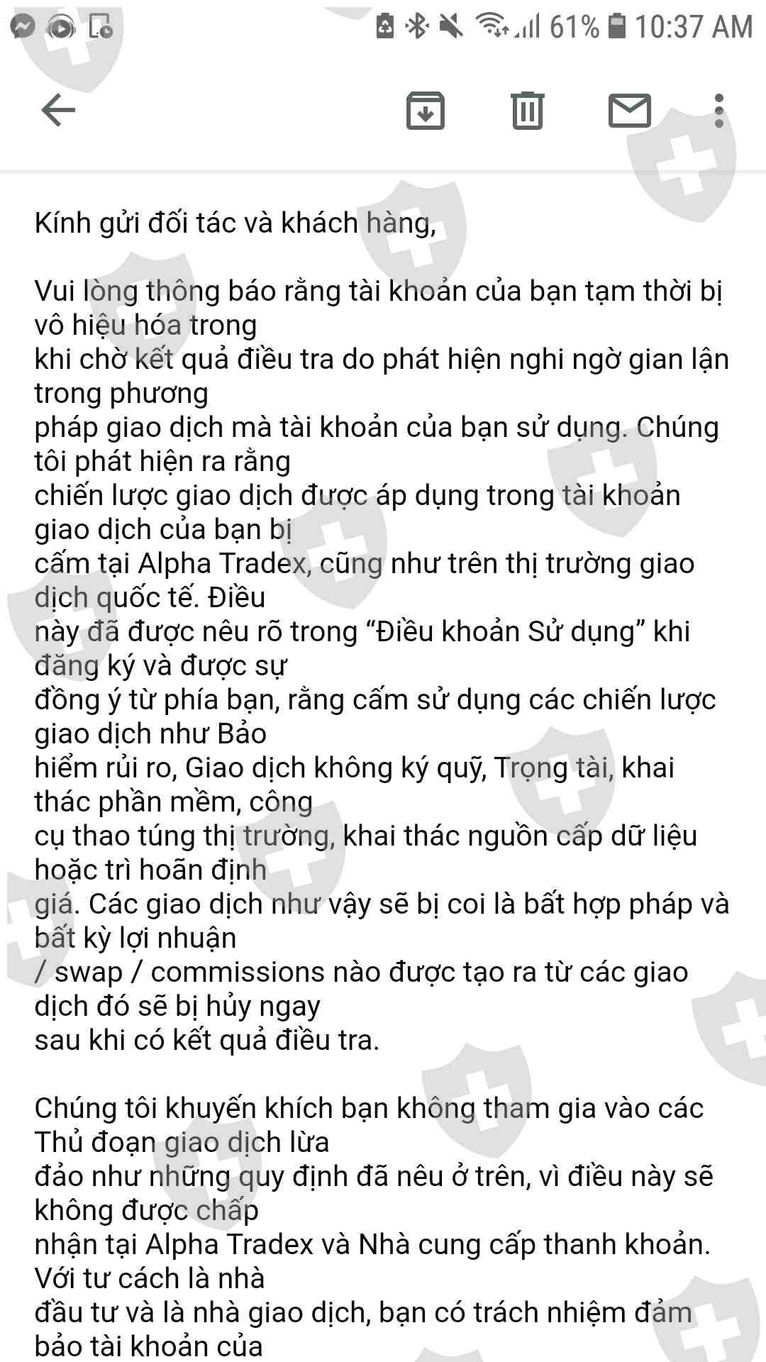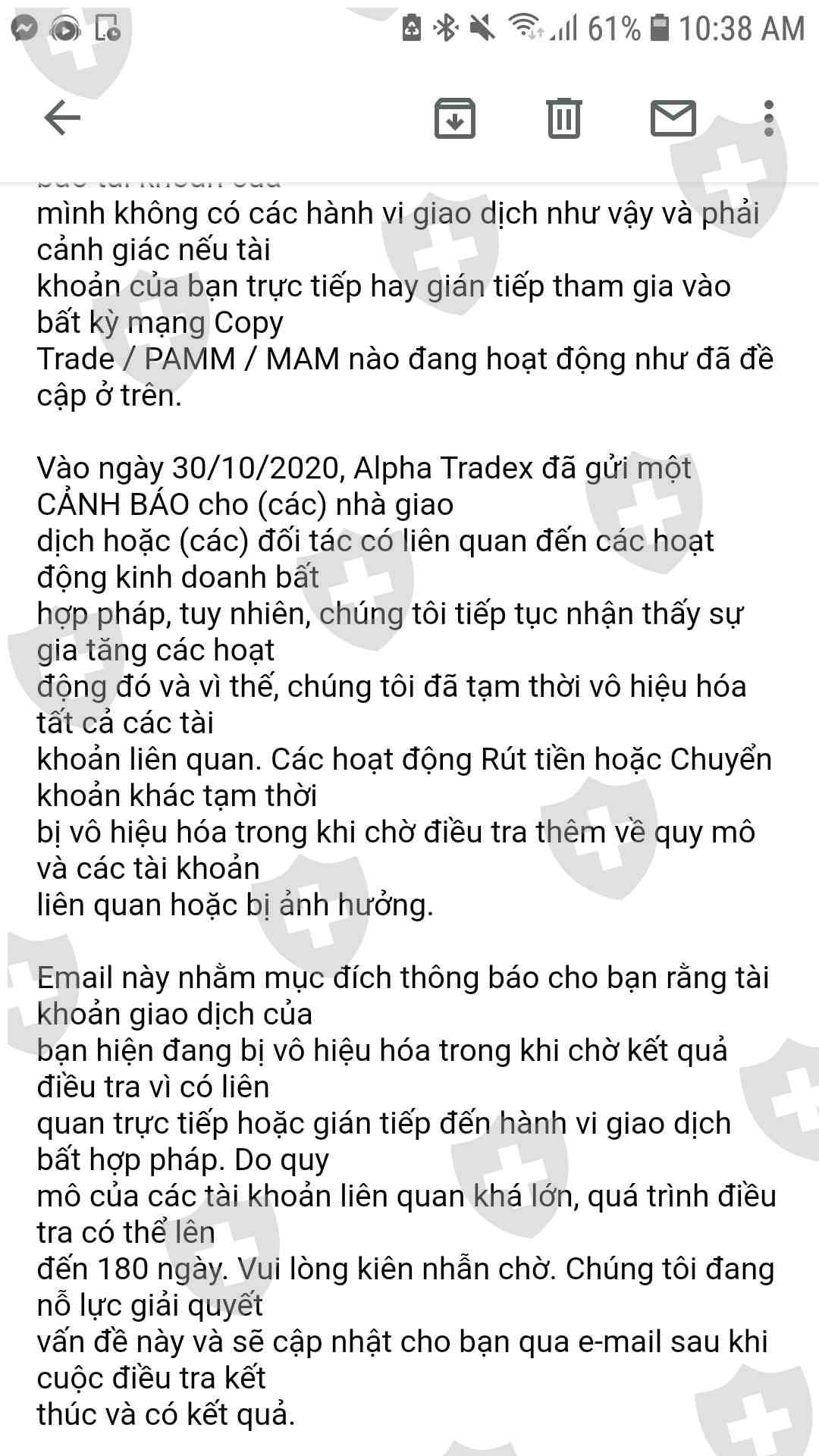Tôi tham gia trade trên sàn từ đầu tháng 11. Qua lời giới thiệu của 1 bạn nhân viên sàn vào copytrade master JMC. Ban đầu bạn này nói copy có thể sẽ cháy nhưng không quá 30% tài khoản. Sau đó cháy 50%. Mình nạp vào thêm, cắt copy rồi tự trade. Không lâu sau mình bị khóa tài khoản. Hỏi bạn nhân viên thì là do master có hành vi gian lận nhưng bạn không báo cho khách hàng. Yêu cầu sàn giải thích minh bạch cho khách hàng