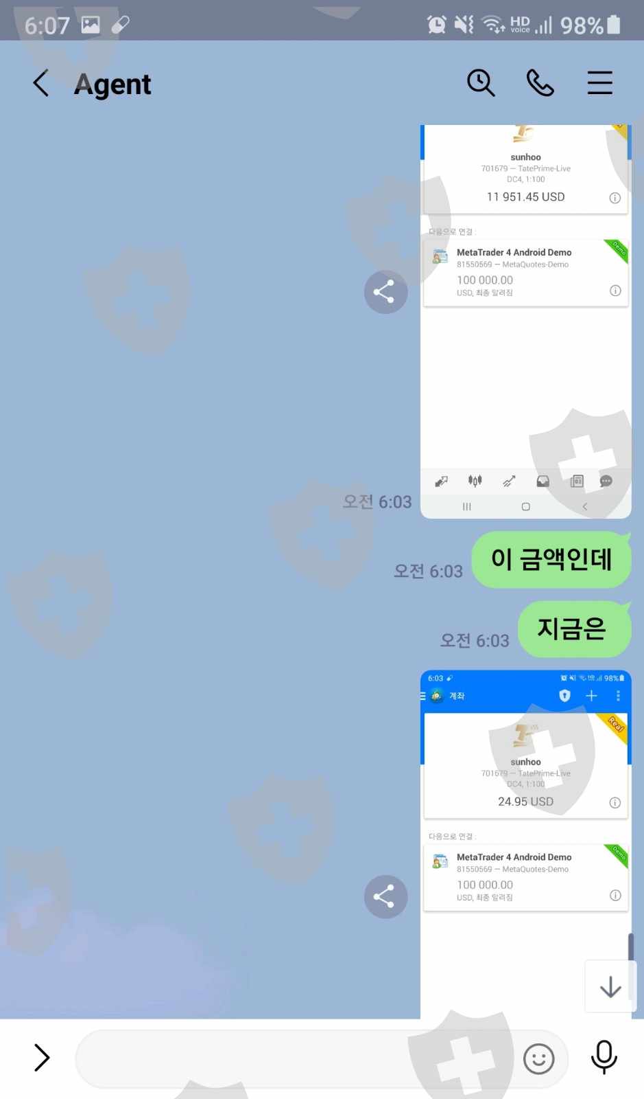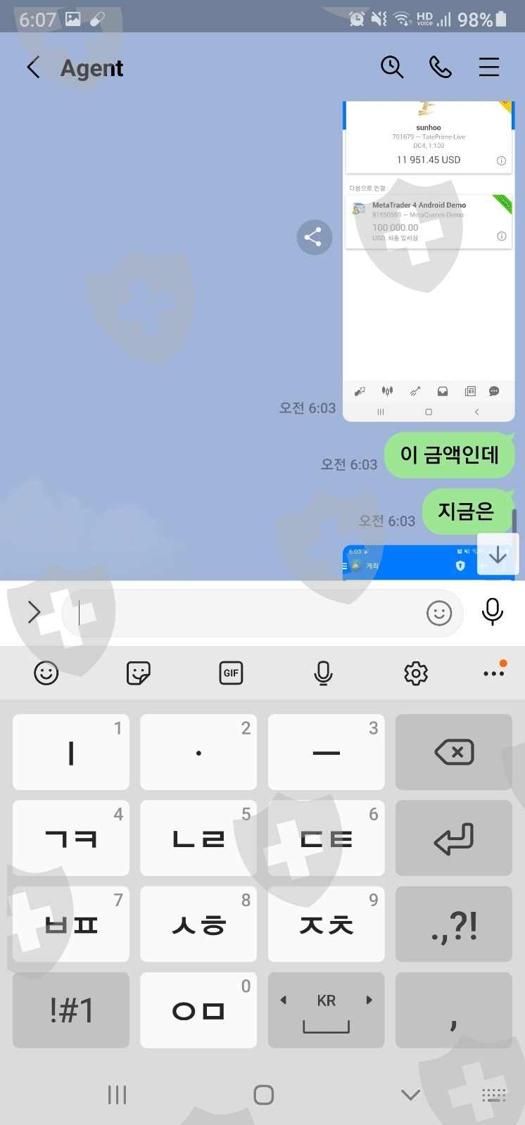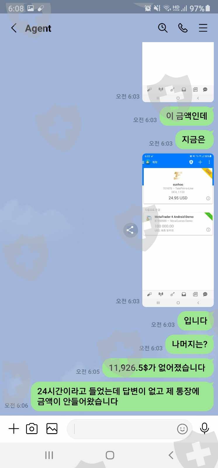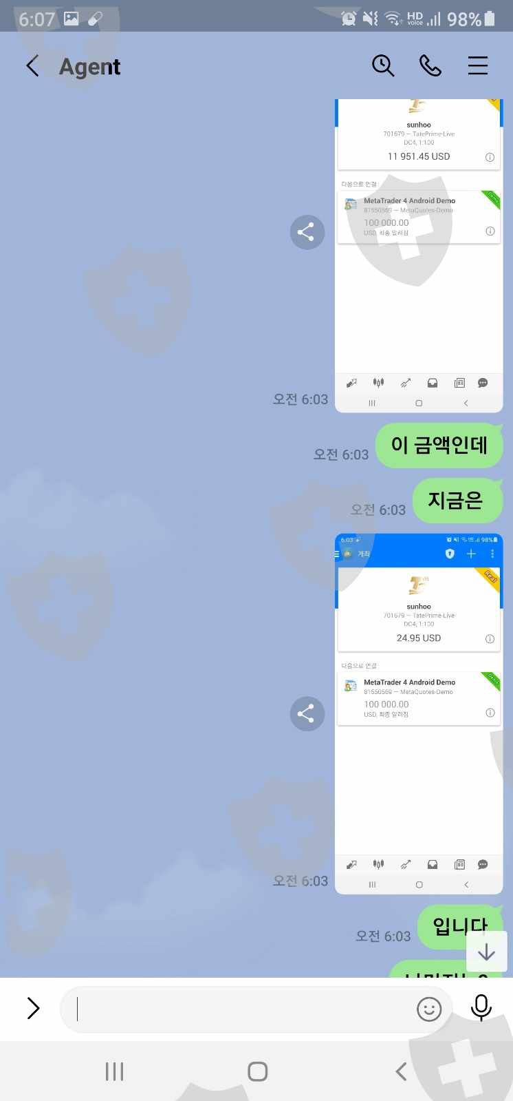 스샷내용은 더 있습니다. 계속 금액이 얼마 있는지 확인하려고 계속 확인했는데 갑자기 돈이 줄어 들기 시작했습니다. 그래서 계속 에이전트에 문의 했지만 나중에 돌아온 이야기는 내가 거래를 했다는 겁니다. 인출을 하려면 영업일기준 3일을 기다려야 받을수 있는걸 알고 아무런 거래를 하지 않았습니다. 받기로 한날에 돈이 안들와서 확인을 하니 시스템오류로 점검한다고 이야기 하더군요. 그 다음에 갑자기 제가 하지않은 돈이 사라지기 시작해서 나중에 내역을 보니 거래를 해서 돈을 거의 없애 놨습니다. 제가 거래를 한것도 아닌데 돈이 거래가 되고 에이전트는 자기들이 책임이 없고 나에게 있다고 무시를 합니다. 이런 거짓된 정보로 저의 돈을 갈취한것에 대해서 화가납니다.
