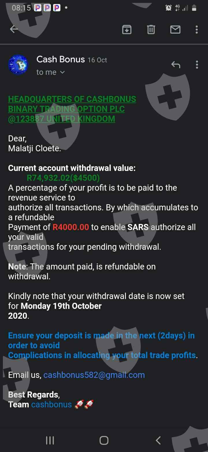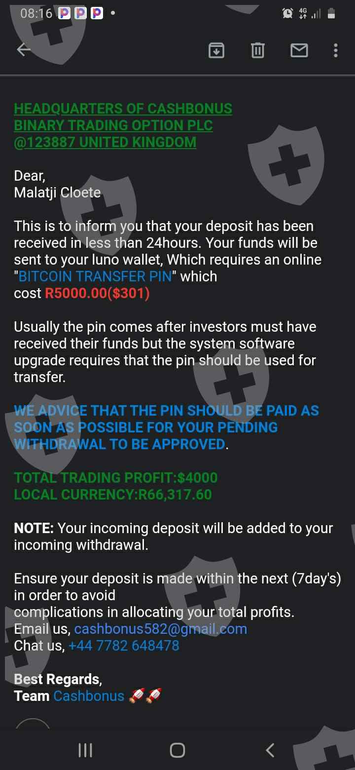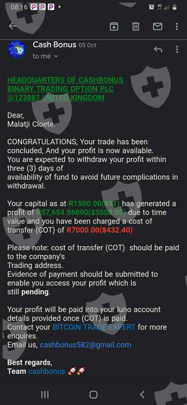 I invested with this broker Cash bonus they show you everything but you cant withdraw the money the broker keep on clamming the money after money it's a Scam by the Name of the Lady lindiwe Bokamoso it's a guy clamming to be a lady