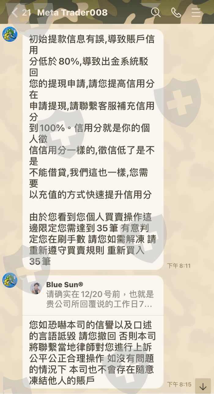辦理出金一再延誤刁難本是自由進行交易市場,確還要求達到35筆交易筆或者補充信用分的才讓出金,貌似違法黑平台。