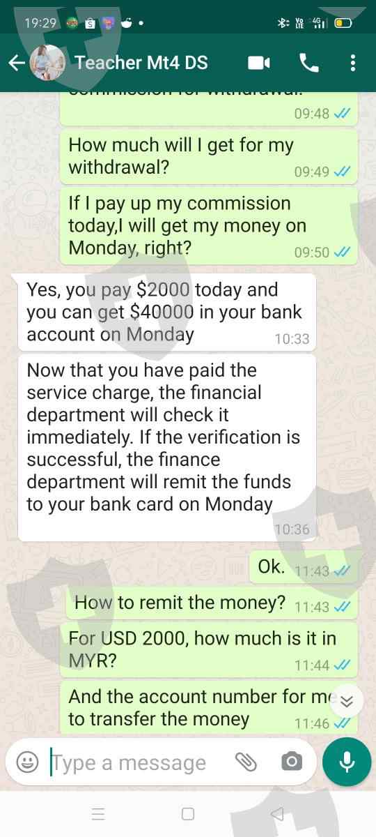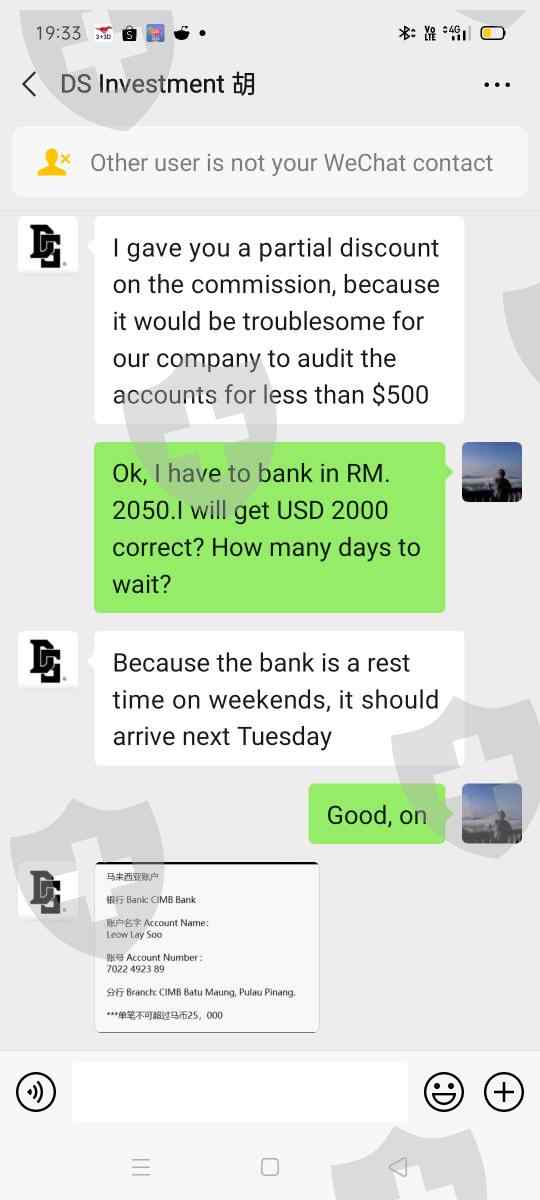 都是骗局。去年11月,告诉我支付2050 MYR来提取2000美元。没有钱进来。然后请我以2000美元的银行存款作为佣金提取40000。已承诺在2020年12月21日将这笔钱。没有。女老师的借口(+85267286091)今天是星期三。电话响了,但这位女士拒绝接听。我在DS投资上还有58792.70。被告知高先生已入侵我的帐户。因此必须更改为新帐户。新帐户为零。各位小心。