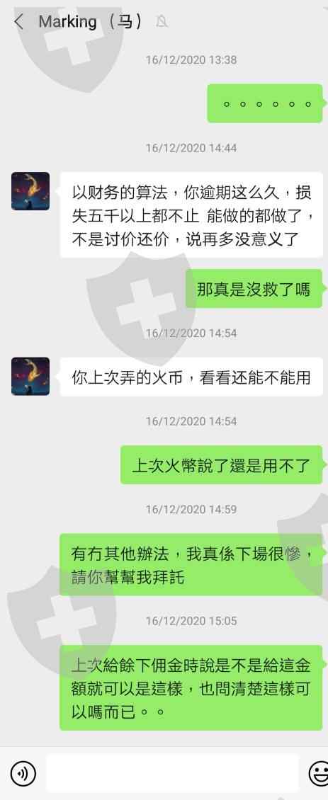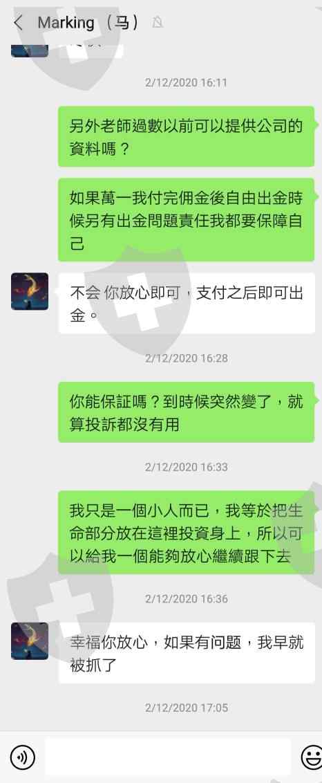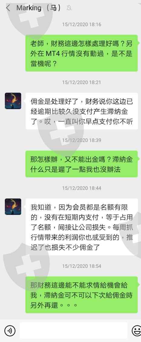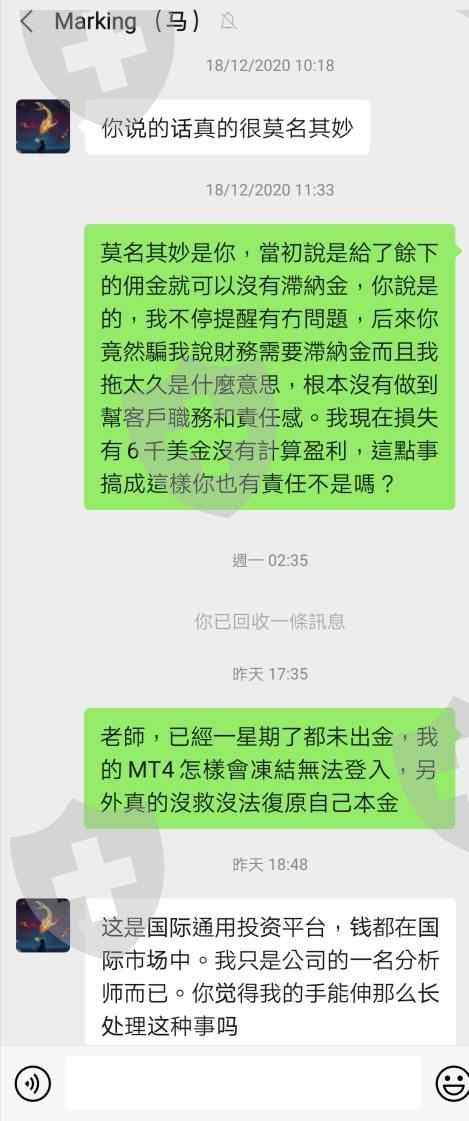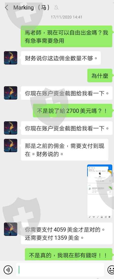 從9月10日開始到現在12月,從朋友成功經歷介紹我推薦加入馬老師團隊,一開始入了有2000美金,兩個月內增加不少利潤,但直到有事想出金時先付2700佣金,到頭來付完後又說付不夠,另外又付1359美金,準時在12月10日前已經支付完等通知,結果等了一星期老師再次以滯納金理由無法出金。老師每次都不會通知客戶是否支付數目正確交給財務,不付責任還對客戶態度較差,詐騙分析師公司并沒有客服聯絡,請監管平台幫忙跟進這間黑平台。