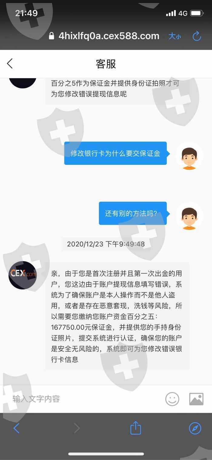 假冒CEX平台,诱惑诈骗,声称有专业老师带队百分之百盈利为诱饵,还给相等的配资,盈利后结算佣金,实际盈利后无法提现,说账号错误,需要交纳保证金,才能提现,存在诈骗行为,现投资的15万元的本金无法追回!