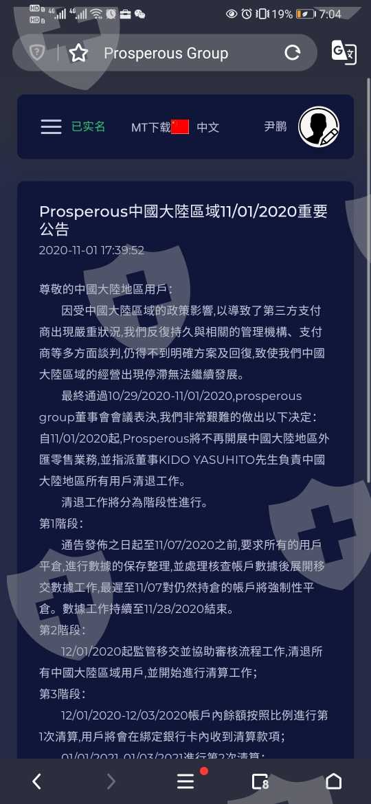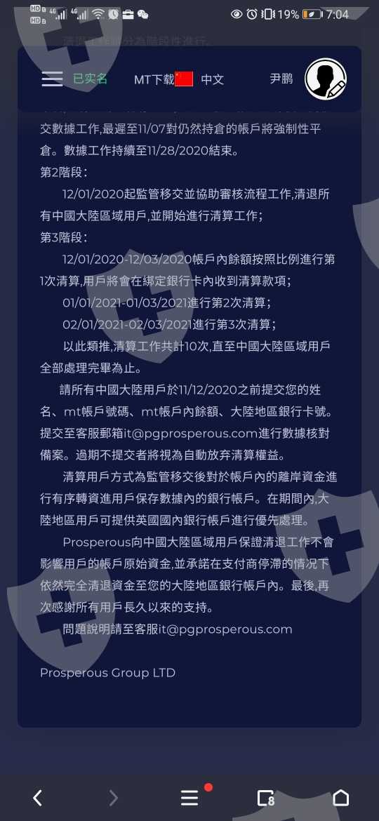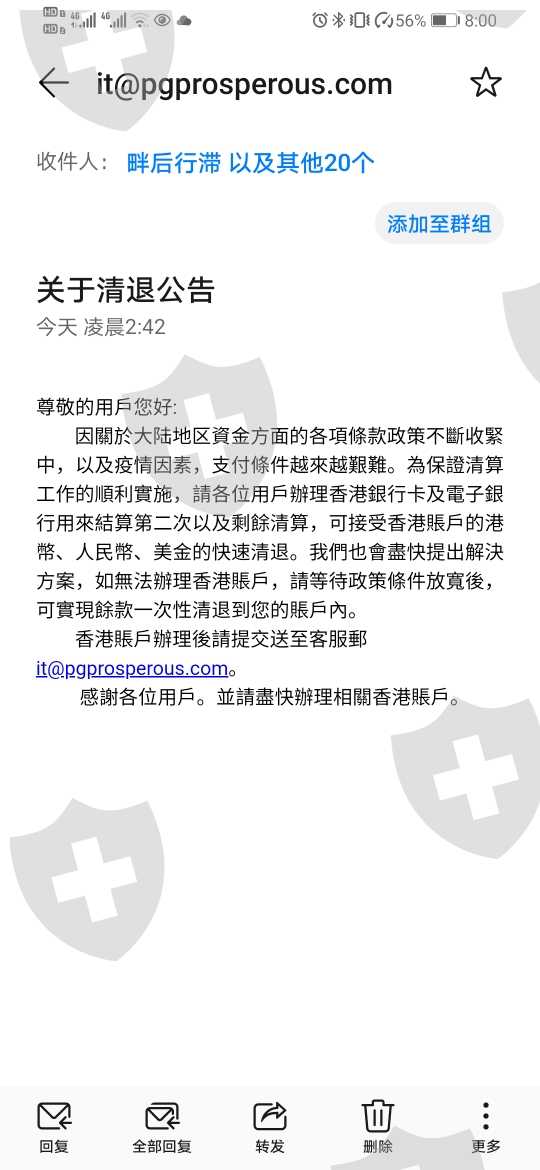 10月份开始不给出金,后来出公告说平台倒了要清算,分10次清算。12月初收到一次10%的清算金额。第二次清算还没开始,所有用户收到了要求办理香港银行卡才给清算的邮件。