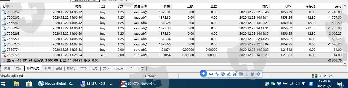 改后台数据!2020.12.25号,账号全部添加21 22 23 号单子,爆仓!注意看电脑右下角时间,这样的账户还有三十个!