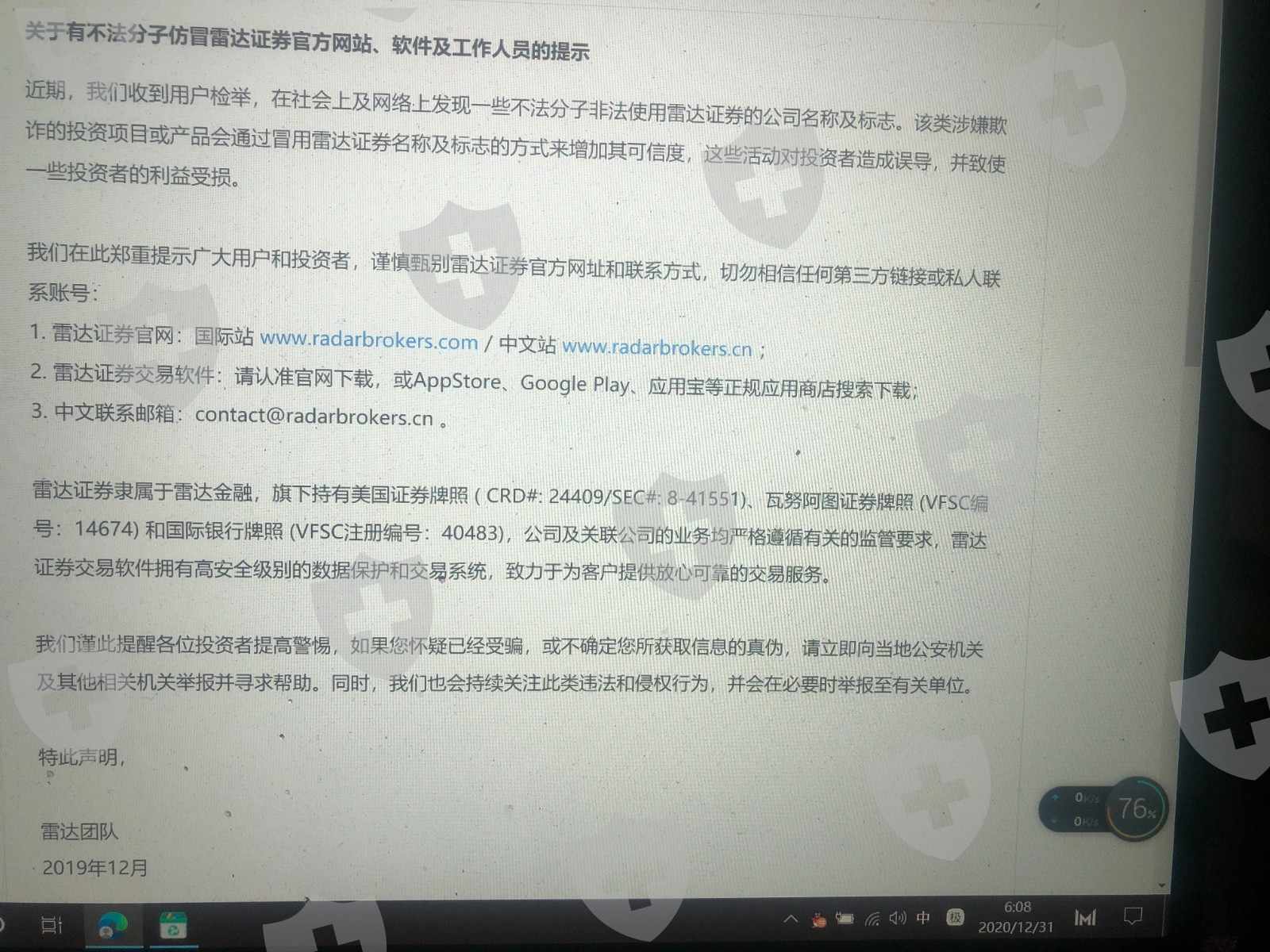 可以查询到两个雷达证券,其实是同一家,换了个马甲而已,我来给你们证明一下哦,雷达证券网站的截图,www.radarbrokers.com这是第一个那个问题雷达证券的网站吧,那么雷达证券在网站贴的雷达证券官网也是同一个,有图有真相哦,下图来自雷达证券网站,雷达证券不用狡辩,我是最了解雷达证券的,我的料多的是,假的真不了,换个马甲我认识你,看下图吧,郑重提示大家,请远离该平台。