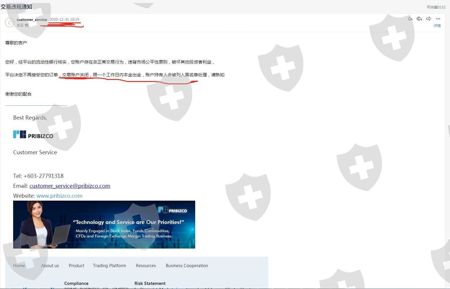 我本人在pribizco开了账户并且入金500美金之后,期间开仓平仓没有任何问题,昨天我看到有人投诉说不能登录后台,我就试了试我的账号,结果也像他们一样的情况,锁上了我的账号后台,还发邮件说我违规,请问pribizco我要是违规,还违规亏钱给你们吗?真是不管任何原因,入了金不管你是否亏钱赚钱就封账号,这不是明摆着拦路抢劫骗你入金吗,等入金了就封你的账号,吞你的本钱,我不知道这样的外汇平台是要干什么,是准备圈钱跑路吗?,黑心老板,还我的本金,还我的血汗钱。这次投诉希望更多的朋友看到,千万不要入金pribizco,这就是个圈钱的骗局 !