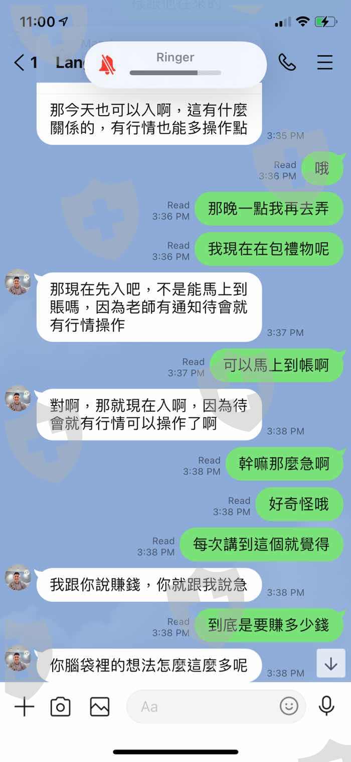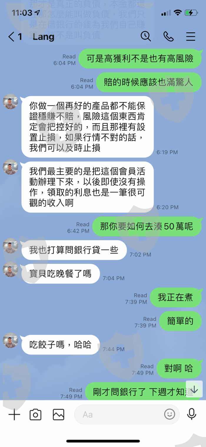 在交友平台认识带我操作的男子。因为我罹患癌症无法工作一个人在家希望有人可以关心。这名男子每天从早到晚陪我聊天嘘寒问暖,鼓励我一起奋斗,要带我操作获利偿还我的房屋贷款。这位男最后也失去联络都不读信息。