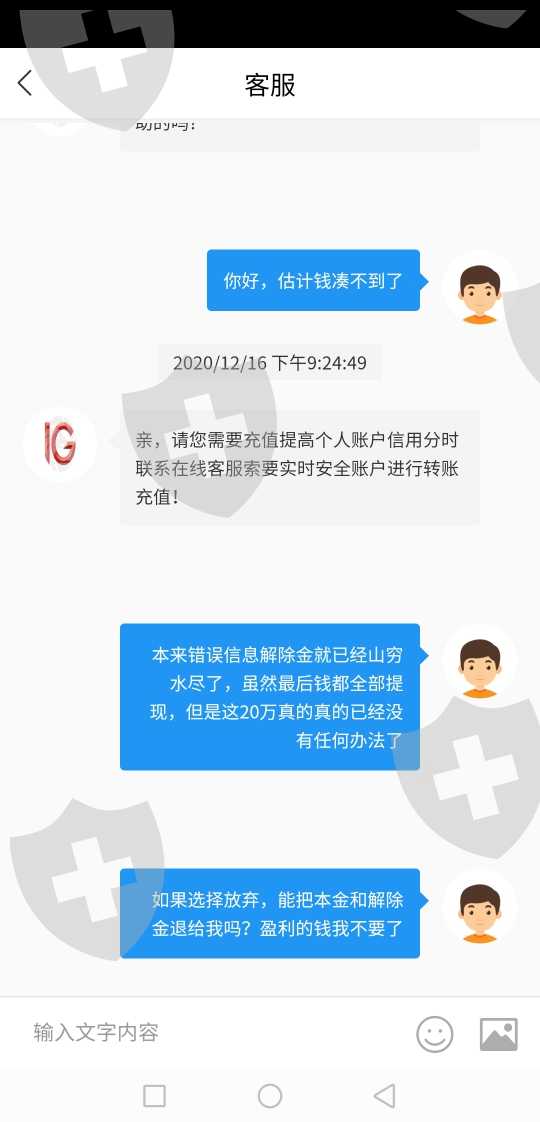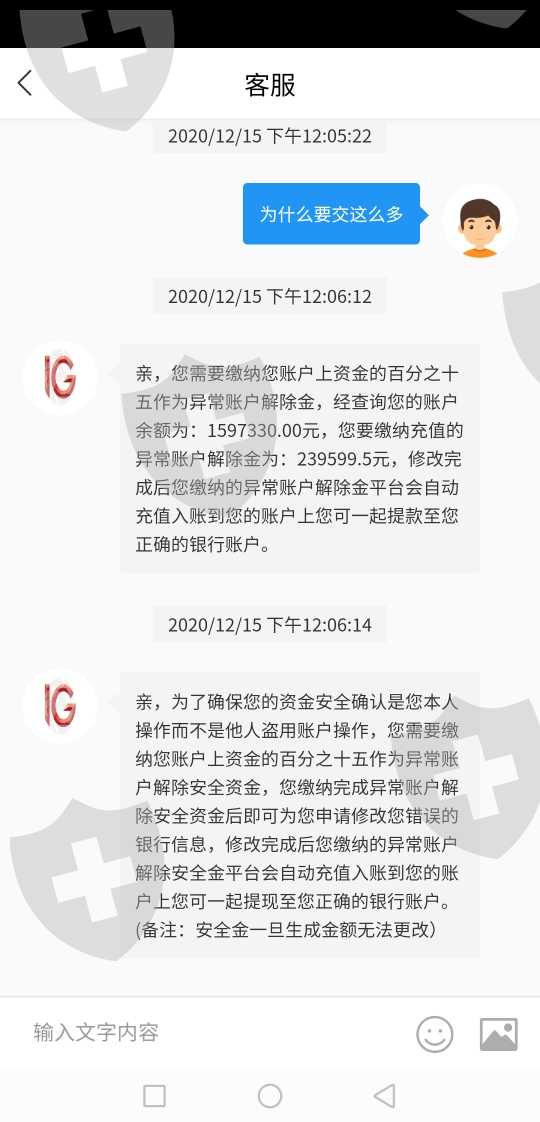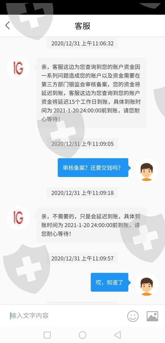 就是看在属于被监管的平台,作为老百姓就相信了IG平台,从投入本金130760元到操作完,以银行卡信息错误开始,不停的让交钱。一开始真以为是自己输错了,所以作为忠实客户,选择无条件相信,就一而再而三的交钱,最后客服告诉我没有任何问题了,但还是等15天审核。我很想知道如果你平台真的不是骗人的,互联网时代,需要审核什么需要15天,说白了就是骗人的,不出金。