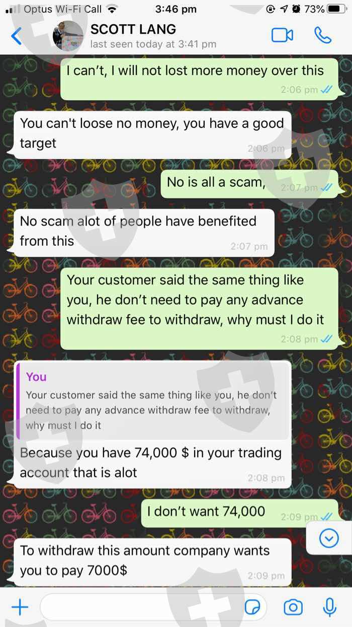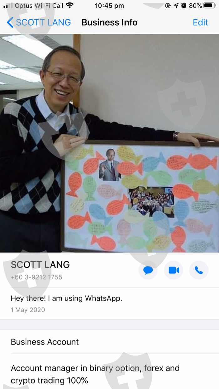 此人通过Facebook与我联系,他的名字叫Scott Lang,据称是来自马来西亚,马来西亚的联系电话为+60 3-92121755。骗子可以在任何国家/地区在线注册任何号码。后来我根据IP地址从尼日利亚发现了他,而Facebook个人资料被他人盗走了。凭借低至$ 500美元的美元,他使用了一个自动交易平台就产生了超过$ 40,000美元的利润。我被要求支付10%的佣金,我交了但是没有拿到钱。帐户未关闭,联系方式丢失